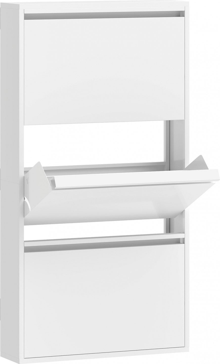 Dodejte svému vstupnímu prostoru úhledný a elegantní vzhled s botníkem! Tento štíhlý botník nabízí tři výklopné zásuvky, do kterých lze kompaktně uložit až 6 párů bot, a praktickou povrchovou polici na věci denní potřeby. S hloubkou pouhých 15 cm je ideální do malých prostor a díky bezpečné montáži na stěnu je obzvláště vhodný pro domácnosti s domácími mazlíčky.
