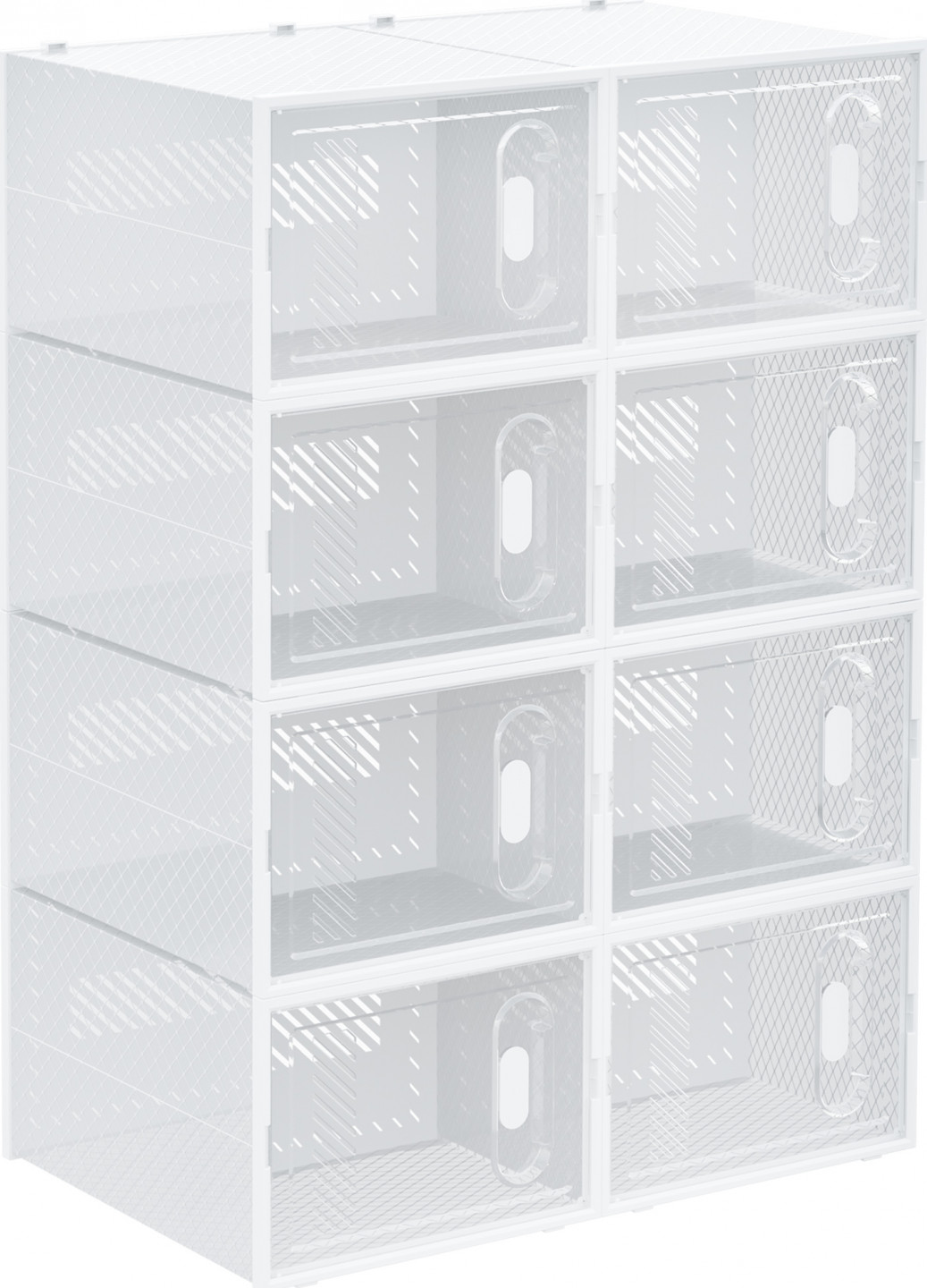 Nechcete už, aby vaše boty stály otevřeně ve skříni a prášilo se na ně? Průhledný botník nabízí flexibilní design s 8 boxy, které můžete uspořádat individuálně. Díky výřezu v horní části lze tyto police bezpečně stohovat na sebe. Vše navíc rychle najdete díky průhledným plastovým panelům poličky ve tvaru kostky. Skvělý a přehledný doplněk do vaší domácnosti!