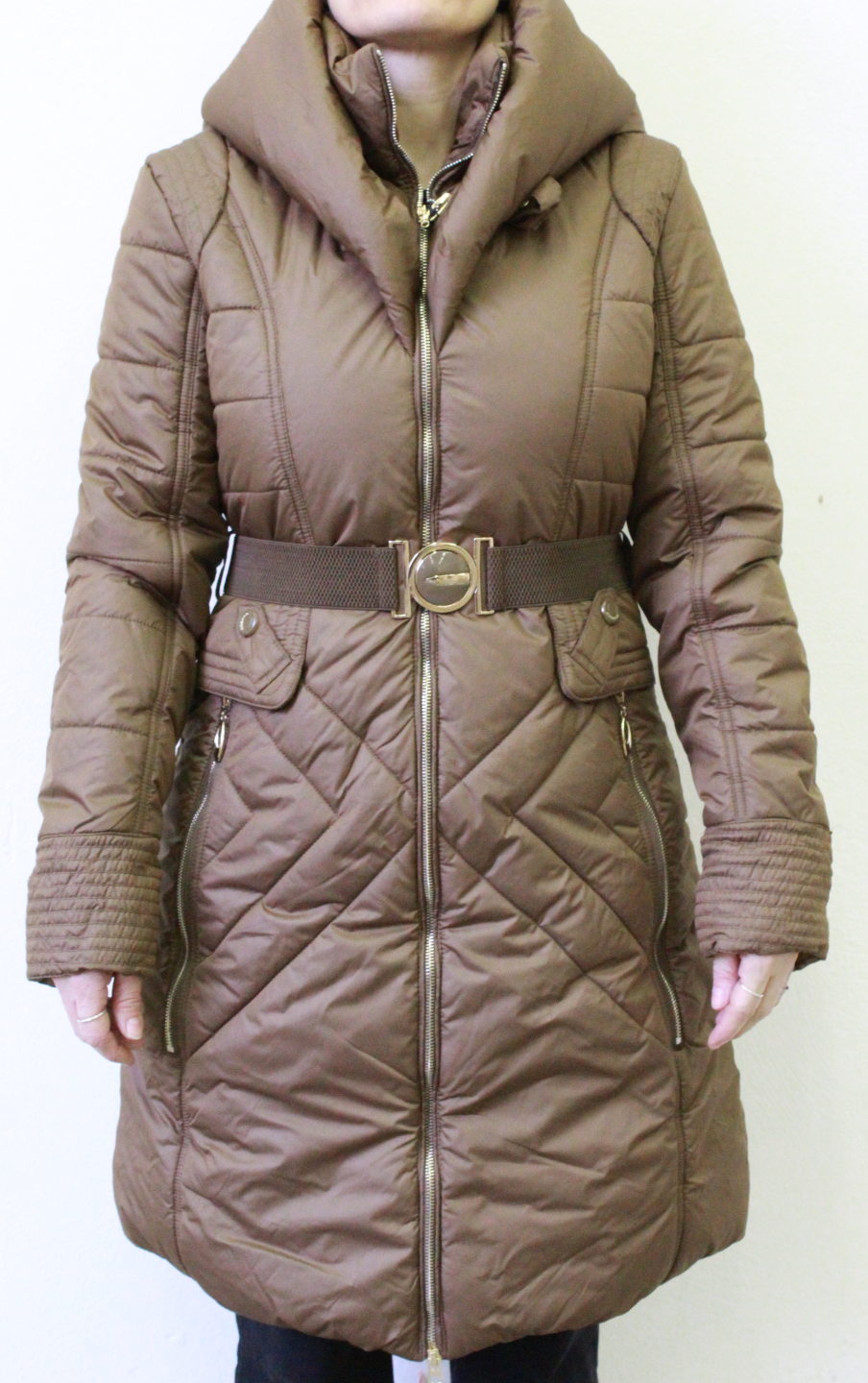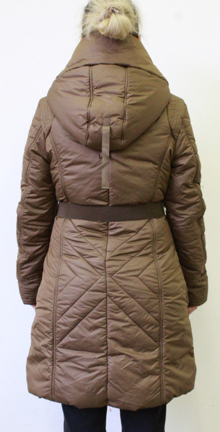 Kabát je v pase s gumovým páskem se sponou, má velkou kapuci.