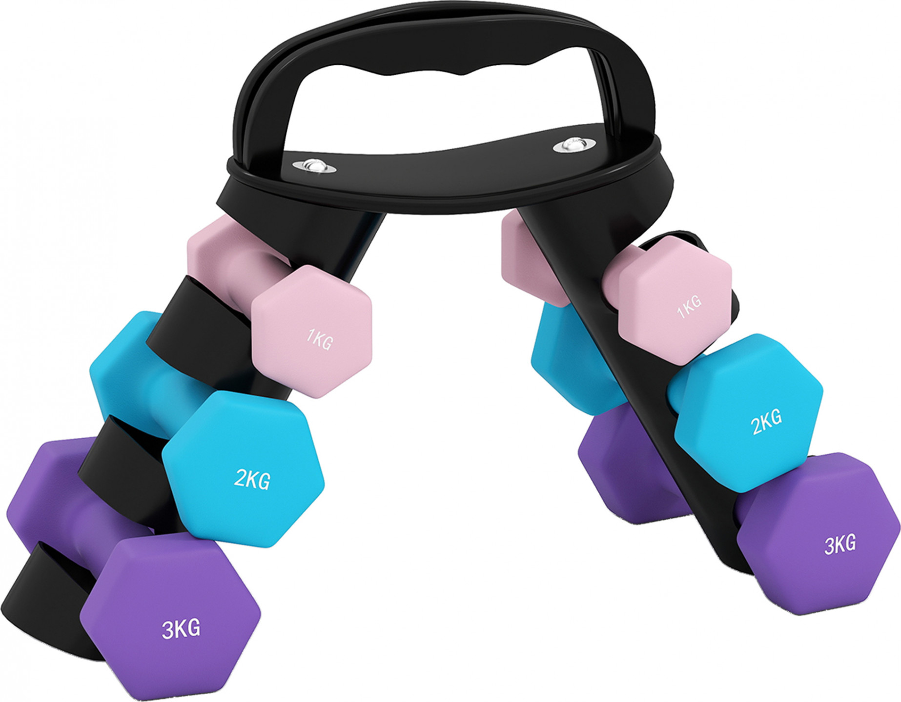 - Kompletní šestihranná sada činek: 2 x 1 kg, 2 x 2 kg, 2 x 3 kg.