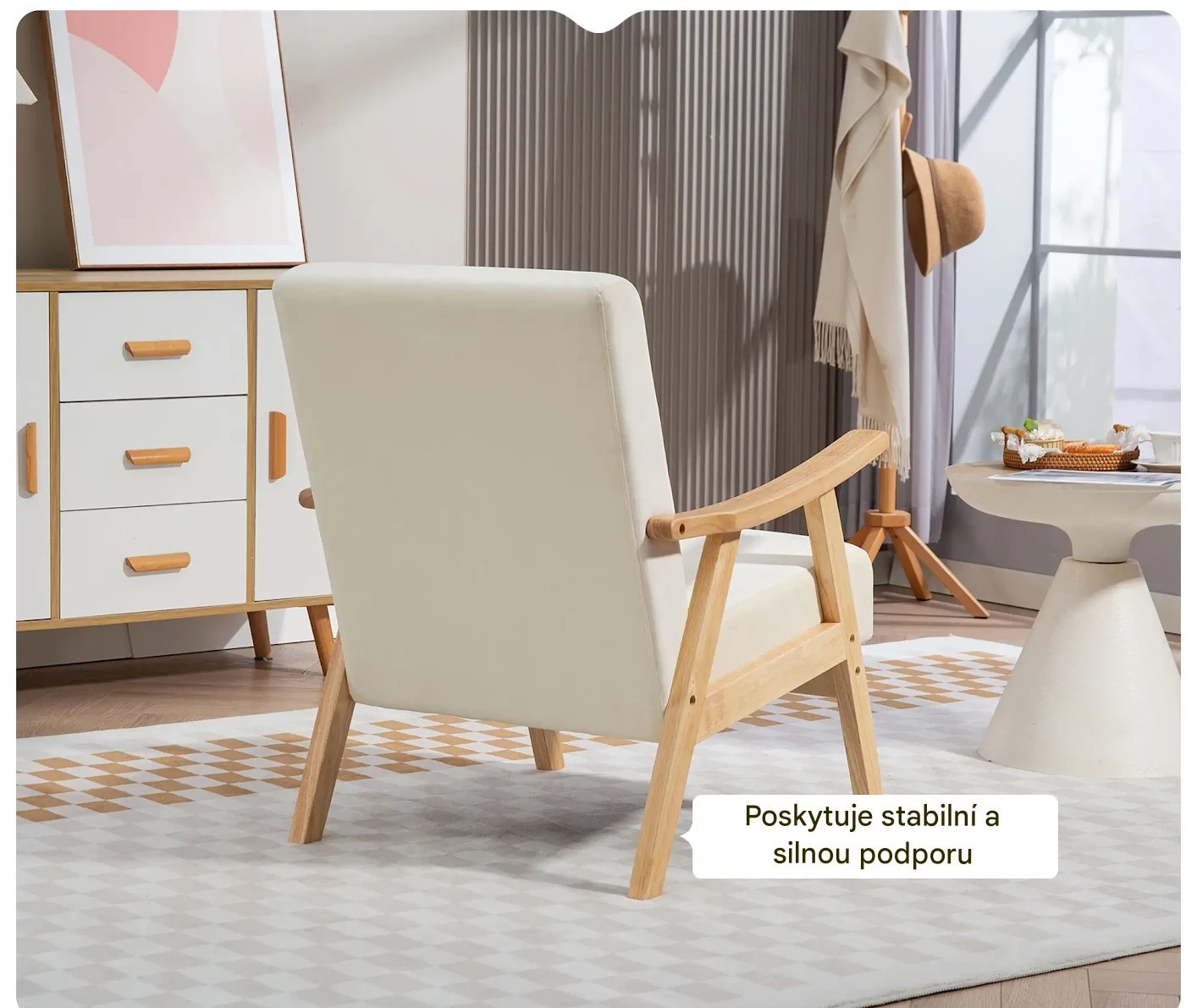 Ergonomicky tvarované opěradlo a měkké polstrování zajišťují vysoký komfort při sezení, ať už při relaxaci, čtení nebo posezení s přáteli. Stabilní konstrukce poskytuje pevnost a dlouhou životnost, zatímco neutrální krémově bílý odstín snadno sladíte s ostatním nábytkem.