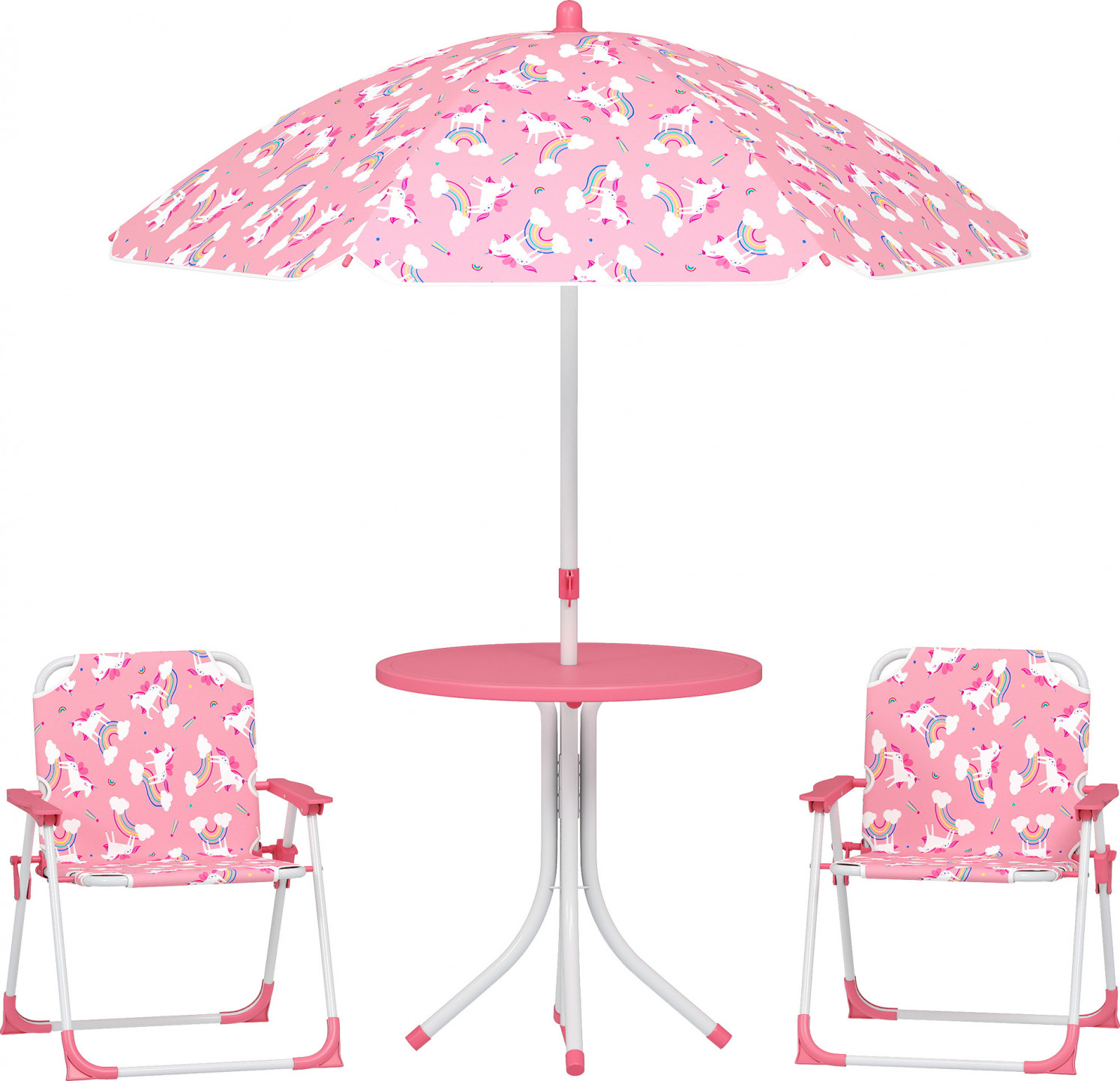 Proměňte svou zahradu v kouzelný hrací koutek s dětskou sedací soupravou, kterou zdobí rozkošný design jednorožce. Sada obsahuje dvě skládací židle a stůl s otvorem uprostřed pro nastavitelný slunečník, který je ideální pro úkryt za slunečných dnů. Sada je ideální pro děti ve věku 2-5 let a lze ji snadno složit a uložit, aby se ušetřilo místo.