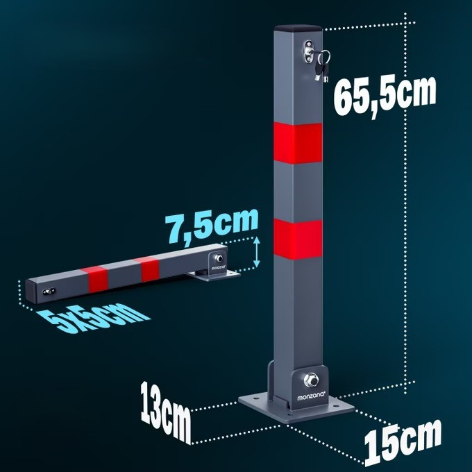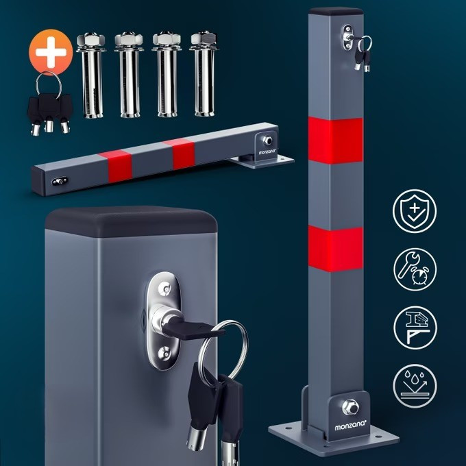 Masivní ocelový sloupek nabízí spolehlivou ochranu vašeho parkoviště nebo příjezdové cesty před nežádoucími hosty. Veškerý montážní materiál a tři klíče jsou součástí balení. Základová deska je předvrtaná, což umožňuje rychlou a snadnou instalaci na pevný podklad pomocí přiložených šroubů a zemních kotev. Parkovací závoru lze během několika sekund složit nebo vyklopit pomocí zámku s výsuvnou zamykací vložkou. Reflexní proužky zajišťují dobrou viditelnost ve dne i v noci.