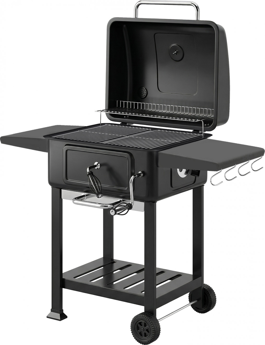 - Postranní stolky, spodní police a háčky poskytují velkorysý, organizovaný úložný prostor pro váš gril na dřevěné uhlí