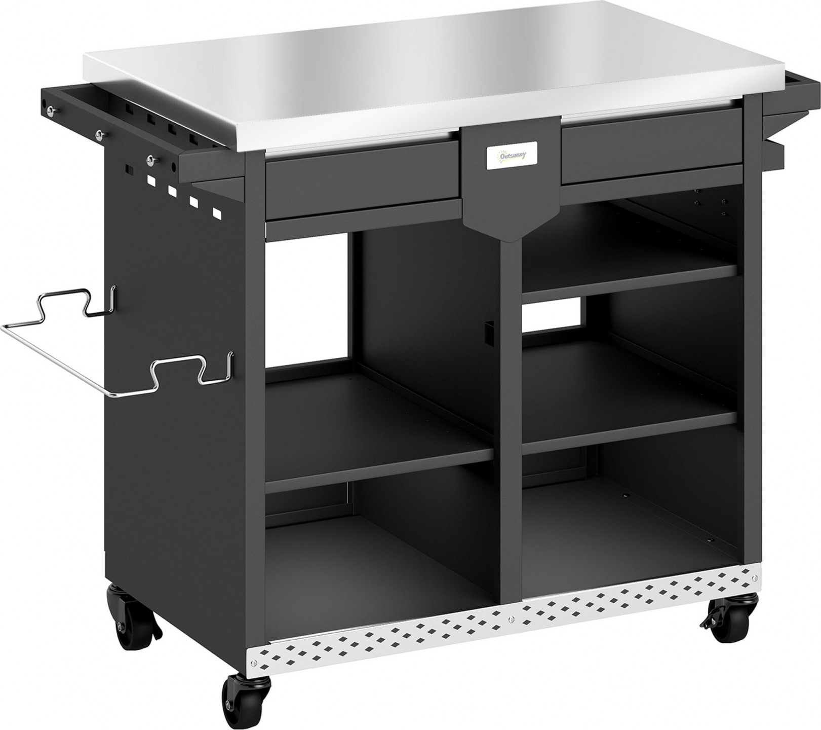 - Otevřené skříňky, nastavitelné otevřené police a zásuvky poskytují tomuto grilovacímu vozíku flexibilní a bezprašné možnosti skladování
