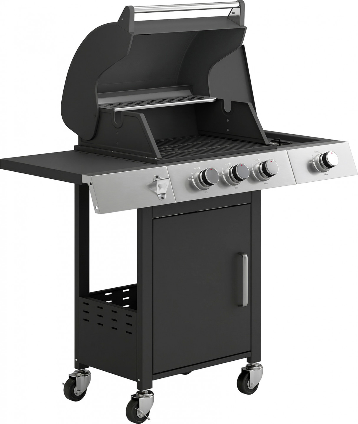 - Tento plynový gril má tři výkonné hlavní hořáky a jeden boční hořák