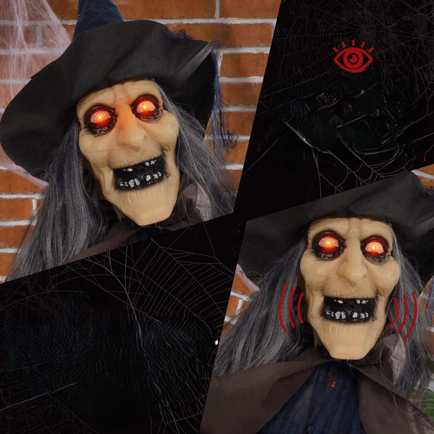 Rozpoutejte strašidelné vzrušení s animovanou halloweenskou dekorací! Tato čarodějnice na koštěti libovolně kroutí rukama a reaguje na dotek nebo hlasitý křik. Se strašidelnýma svítícíma červenýma očima, barevnou svítící dýní a strašidelnou mluvící halloweenskou dekorací bude ozdobou každé halloweenské party. Skvěle se hodí do vašeho strašidelného domu nebo jako působivá venkovní dekorace na Halloween - nažene vašim hostům husí kůži!