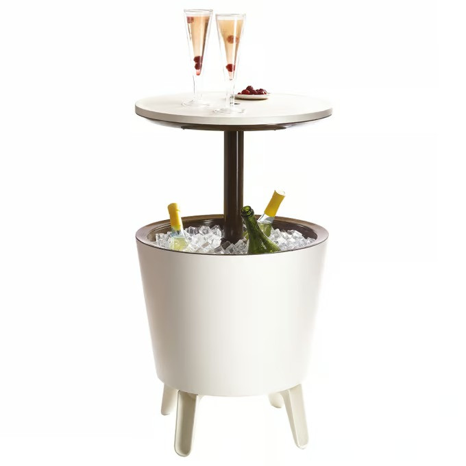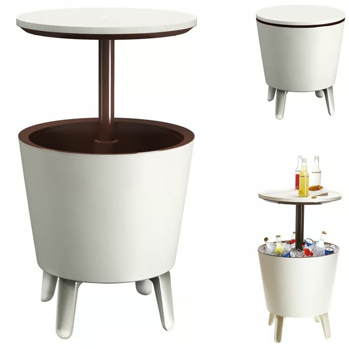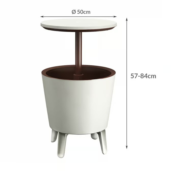 Praktický a stylový barový stolek Cool Bar je ideálním doplňkem pro zahradu, terasu i balkon. V sobě kombinuje odkládací stolek, barový stůl a chladicí box na nápoje. Díky integrovanému prostoru na led udrží nápoje příjemně vychlazené po dlouhou dobu. Stolek je výškově nastavitelný – snadno jej přeměníte z nízkého stolku na barový. Je vyroben z kvalitního, odolného plastu, který je rezistentní vůči UV záření, vlhkosti i povětrnostním vlivům a zároveň se velmi snadno udržuje. Elegantní kombinace bílé a hnědé barvy se hodí do každého venkovního prostoru