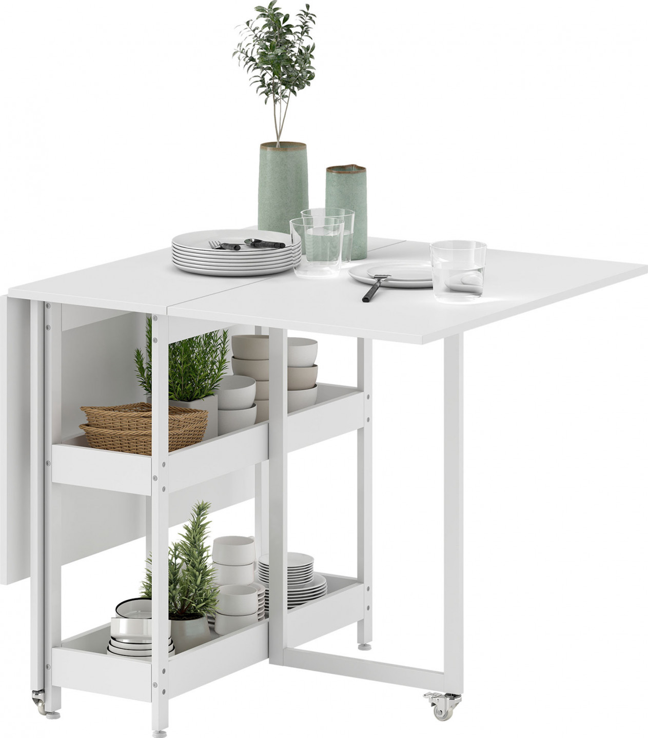Hledáte univerzální jídelní stůl, který se přizpůsobí vašemu životnímu stylu? Pak je pro vás tento rozkládací stůl ideální: je ideální pro malé prostory a nabízí místo až pro čtyři osoby. Dvě rozkládací desky jídelního stolu umožňují flexibilní použití a otevřené přihrádky bezpečně uchovávají různé předměty. Díky robustnímu rámu a hladce se pohybujícím kolečkům s brzdami jej lze bez námahy složit a bezpečně vytáhnout.