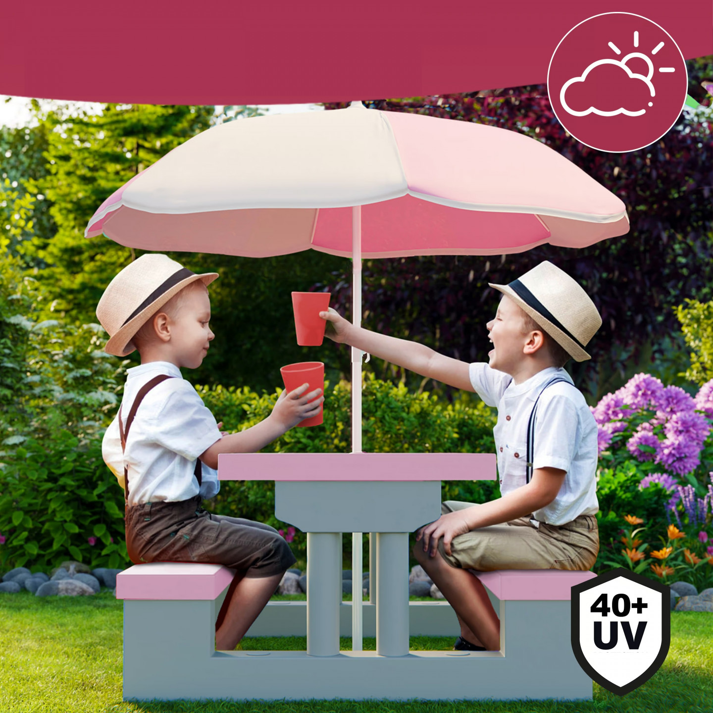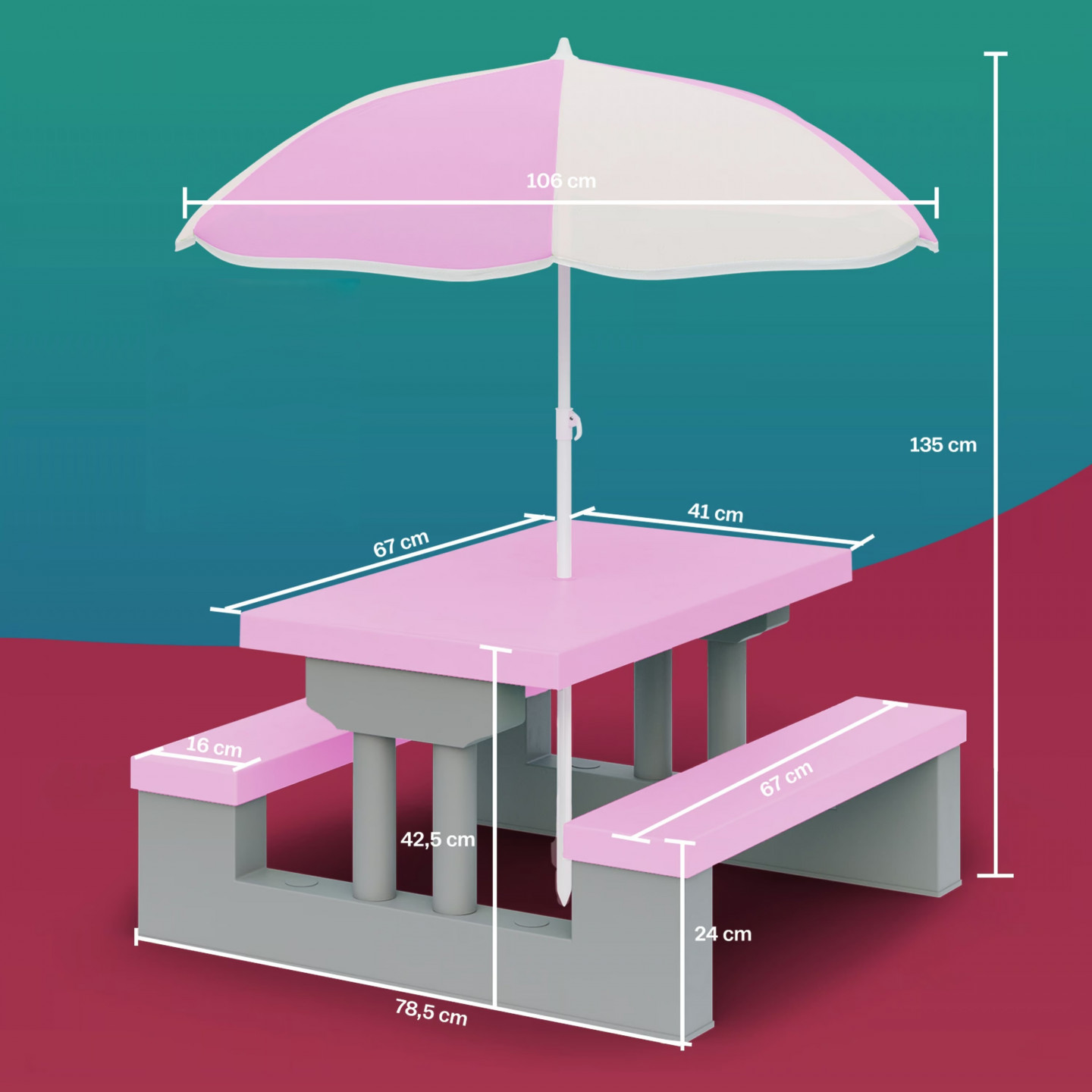 Tato zábavná dětská sedací souprava do interiéru i exteriéru obsahuje stůl se dvěma připevněnými lavicemi a velký slunečník vyrobený ze 100% polyesteru. To zajišťuje dostatečnou ochranu před sluncem při hraní na zahradě nebo na terase. Celá dětská sestava nábytku je vyrobena z robustního materiálu s příjemným povrchem. Všechny hrany lavic a stolu jsou zaoblené , což zvyšuje bezpečnost vašeho dítěte. Tato dětská sedací souprava má navíc velkou opěrnou plochu, a proto je stabilní.