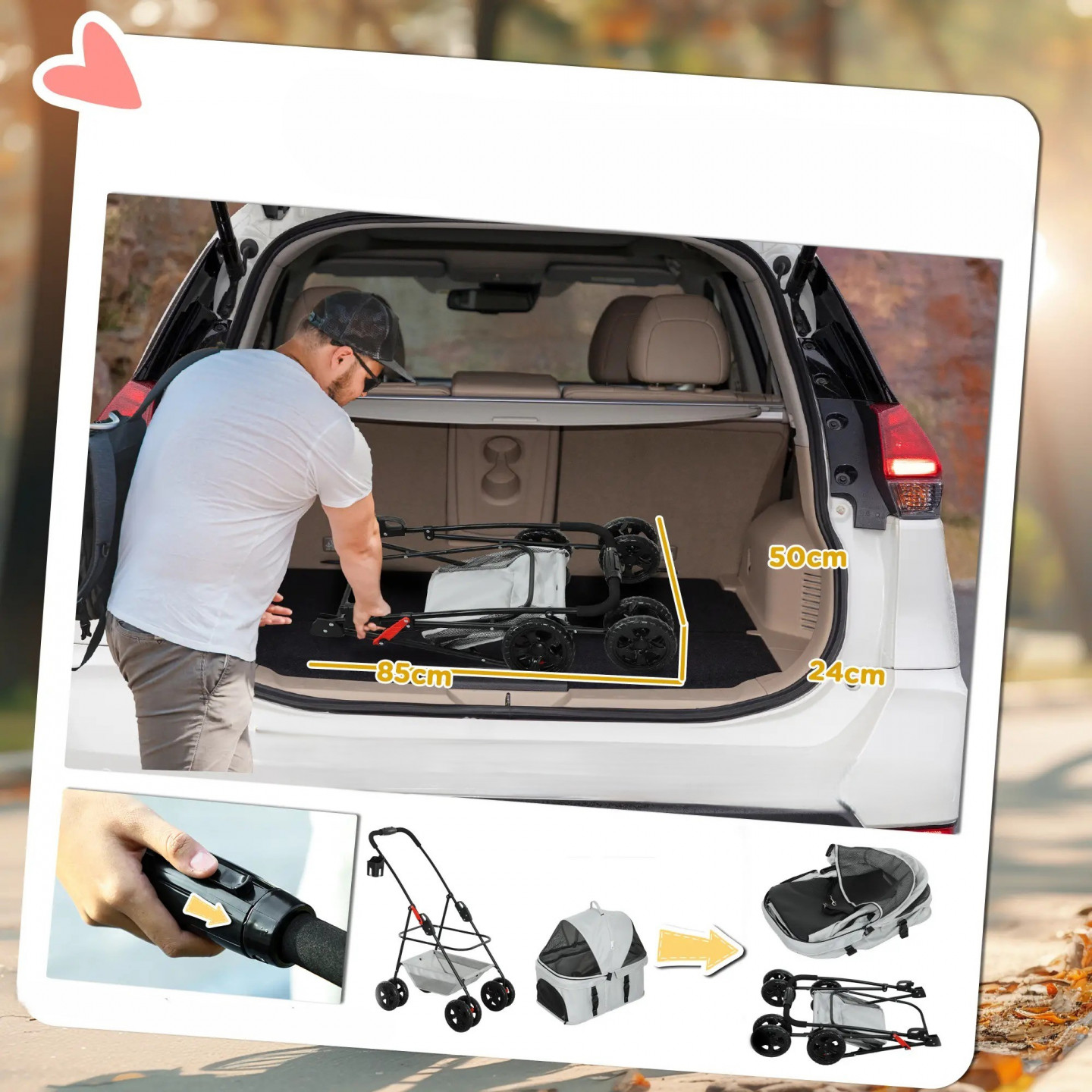 Objevte kočárek pro psy s praktickým designem 3 v 1! Kočárek pro psy se bez námahy přemění z útulného vozíku na autosedačku nebo přenosnou přepravku pro domácí mazlíčky. Je ideální pro domácí mazlíčky s hmotností do 4 kg a jeho odnímatelná korba usnadňuje cestování. Díky jednoduchému mechanismu skládání jednou rukou jsou výlety hračkou. Bezpečná síťová tkanina a omyvatelný, pohodlný polštářek do vozíku pro psy zajišťují bezstarostná, flexibilní a útulná dobrodružství s vaším čtyřnohým přítelem.