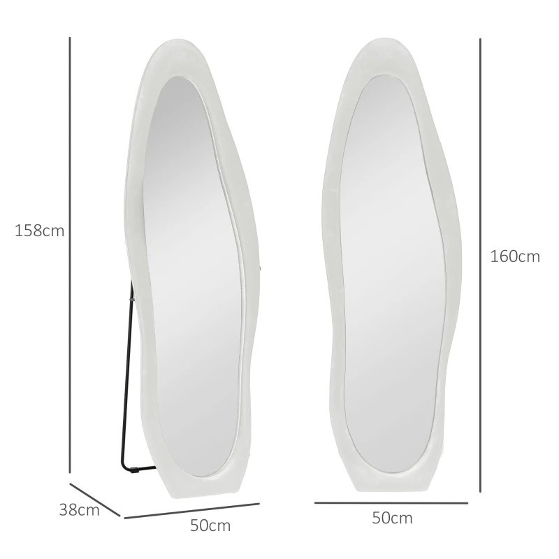 Elegantní a originální volně stojící zrcadlo s vlnitým rámem potaženým jemným sametem v bílé barvě přináší do vašeho interiéru jedinečný designový prvek. S rozměry 160 × 50 cm nabízí dostatečnou velikost pro pohodlné zrcadlení celého těla.