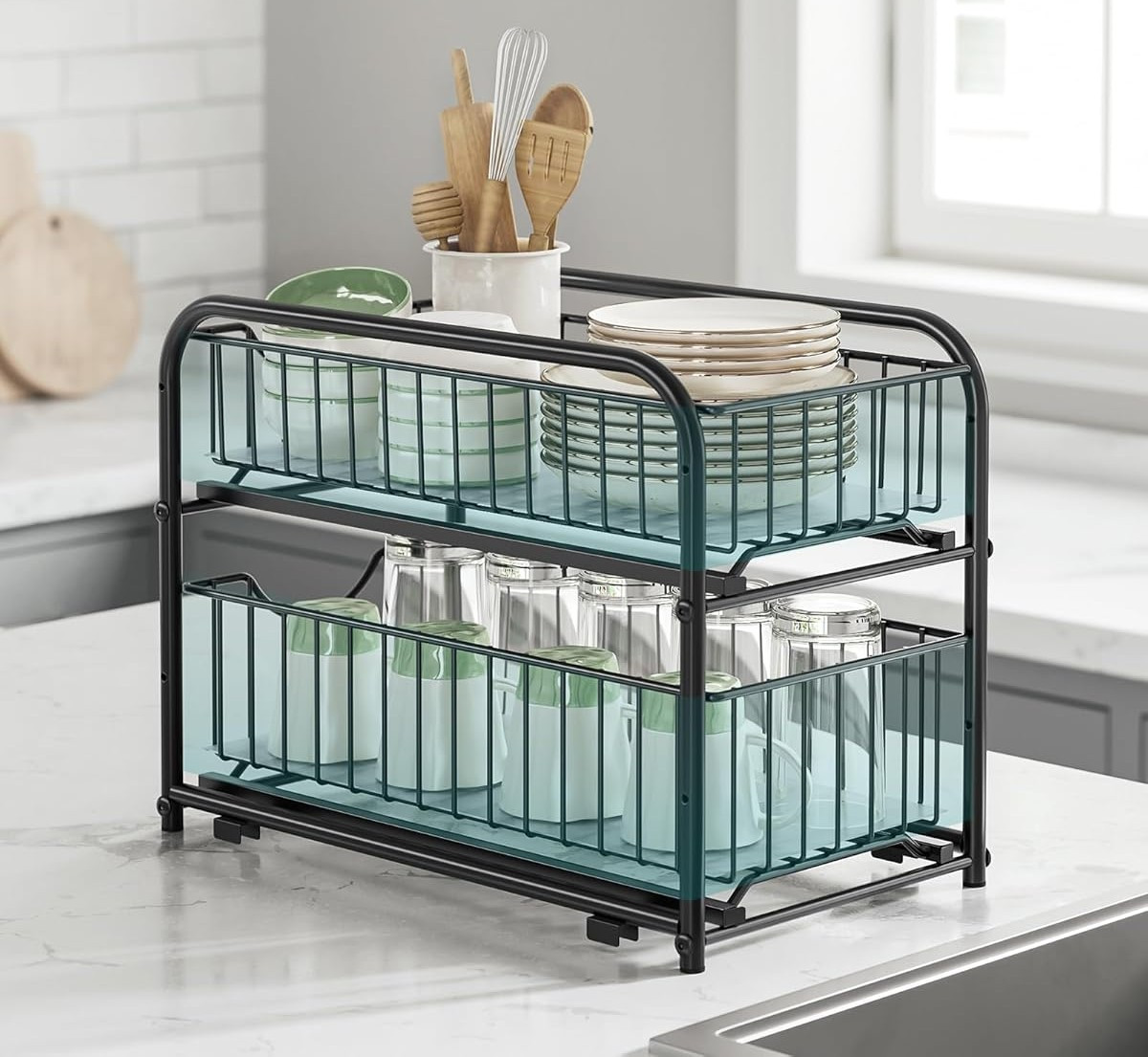 Tento kuchyňský organizér je ideálním řešením pro uspořádání vašich kuchyňských potřeb, kořenek, talířů, příborů či drobného nádobí. S moderním černým designem se hodí do každé kuchyně, ať už máte rustikální, minimalistický nebo industriální styl. Díky dvěma patrovým policím vám poskytne dostatek úložného prostoru, a zároveň šetří místo na pracovní ploše.