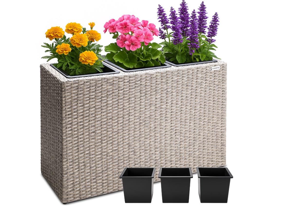 Třídílné květináče jsou ideální pro výsadbu na zahradě, na balkoně, v obývacím pokoji nebo v zimní zahradě. Polyratan je velmi silné, rovnoměrně propletené syntetické vlákno, které bylo speciálně vyvinuto pro zahradní nábytek. Je odolné vůči povětrnostním vlivům, UV záření, nečistotám a snadno se čistí. Vnitřní květináč lze snadno vyjmout.
