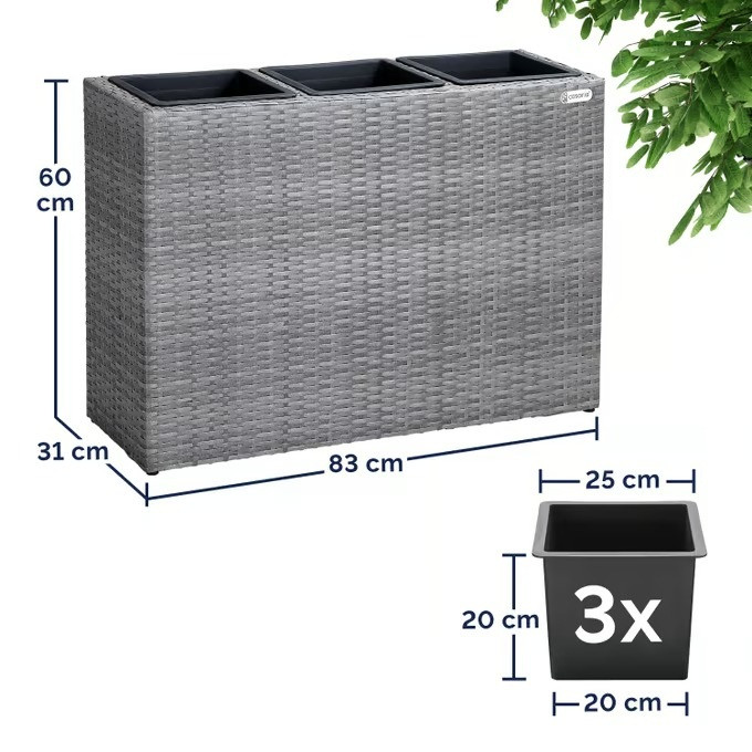Trojitý květináč je ideální pro výsadbu na zahradě, na balkoně, v bytě nebo v zimní zahradě. Tyto stylové květináče vyrobené z ručně tkaného polyratanu jsou skutečným poutačem. Květináče můžete používat venku i uvnitř.Polyratan je velmi stabilní, rovnoměrně navinuté syntetické vlákno speciálně vyvinuté pro zahradní nábytek. Je odolné vůči povětrnostním vlivům, UV záření, nečistotám a snadno se čistí. Vnitřní květináče lze snadno vyjmout z polyratanového rámu a zároveň nabízejí znovuuzavíratelný odtok vody .