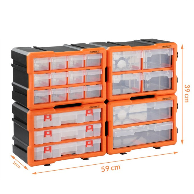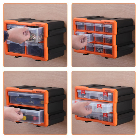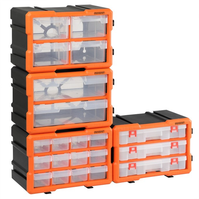 Díky modulárnímu systému pero-drážka lze organizéry na drobné díly libovolně kombinovat a rozšiřovat . Všechny krabice mají odnímatelné přepážky, takže si můžete přizpůsobit velikost přihrádek . Rozměrově stabilní a robustní zásuvky mají na okrajích zarážky, které zabraňují jejich vyklouznutí při příliš silném zatažení. Na zadní straně krabice jsou čtyři montážní otvory pro montáž na zeď. Součástí každé krabice jsou čtyři šrouby.