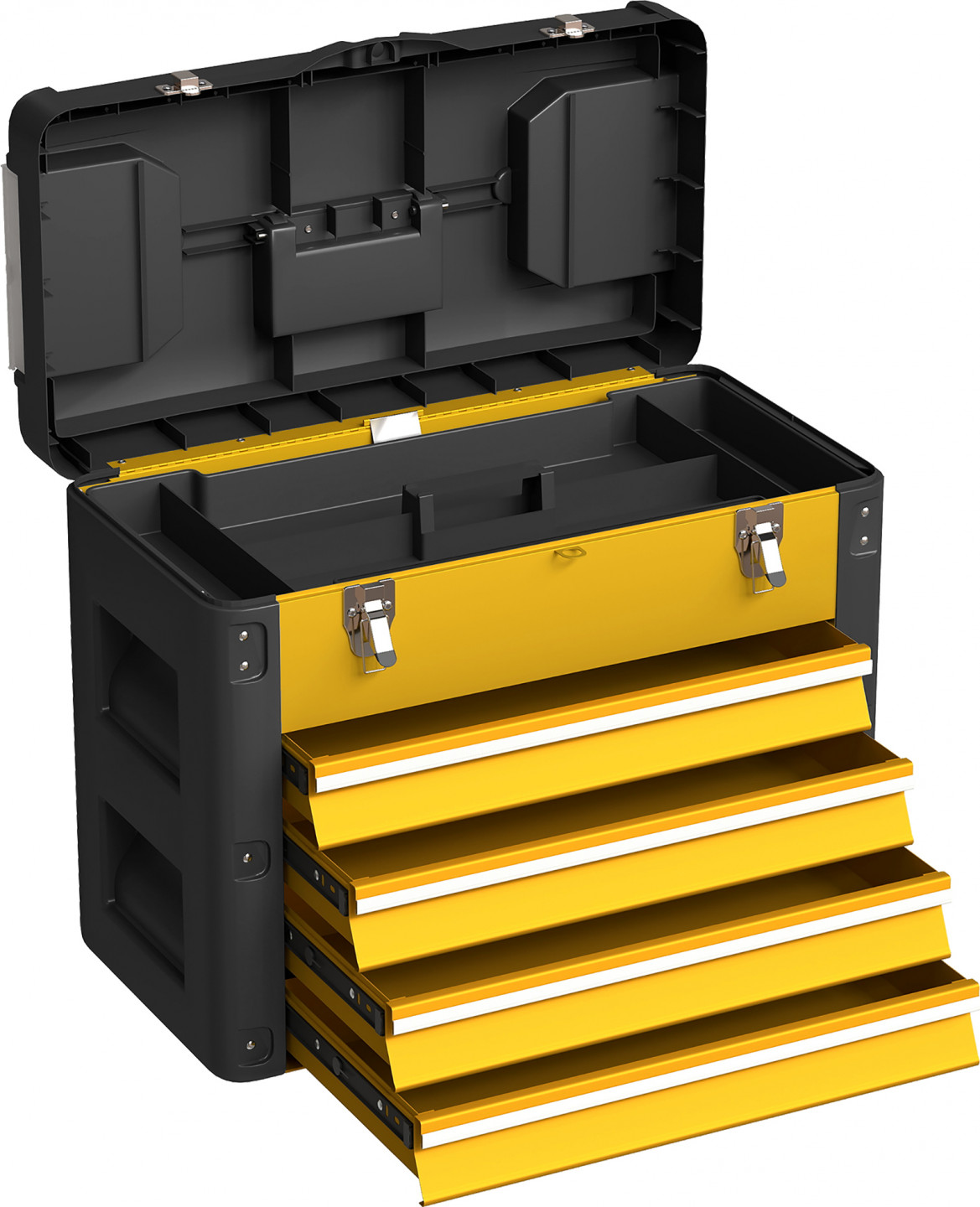 - Tento velký box na nářadí má čtyři zásuvky, velkou horní přihrádku s vyjímatelnou policí a dva vyjímatelné mini boxy na nářadí, které vám umožní přehledně uspořádat nářadí.