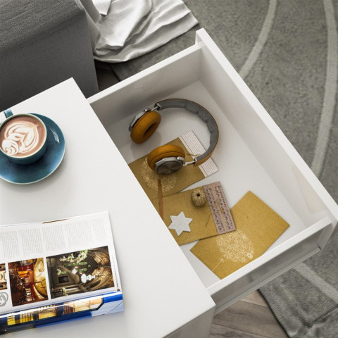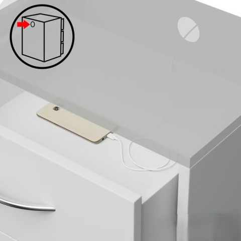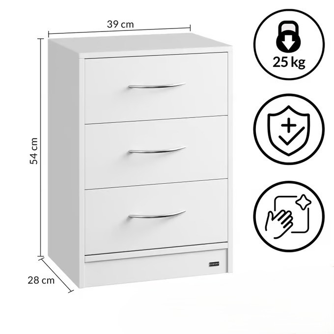 Elegantní noční stolek Eloise se bez problémů začlení do vašeho stávajícího nábytku. Tři hladce se vysouvající zásuvky s chromovanými úchyty, každá s objemem 5 litrů , poskytují dostatek úložného prostoru. Horní police nabízí dostatek místa na budík, knihu, noční lampičku a mnoho dalšího. S výškou 54 cm je komoda vhodná i pro postele s boxspringovým systémem a je snadno přístupná. Díky integrovanému vedení kabelu může smartphone během nabíjení ležet v první zásuvce. Pro větší bezpečnost můžete noční stolek snadno připevnit ke zdi pomocí zamykacího mechanismu v zadní části. Skříňka, která obsahuje praktické chrániče podlahy, je vyrobena z odolné a trvanlivé MDF desky. Povrchy se snadno čistí vlhkým hadříkem.
