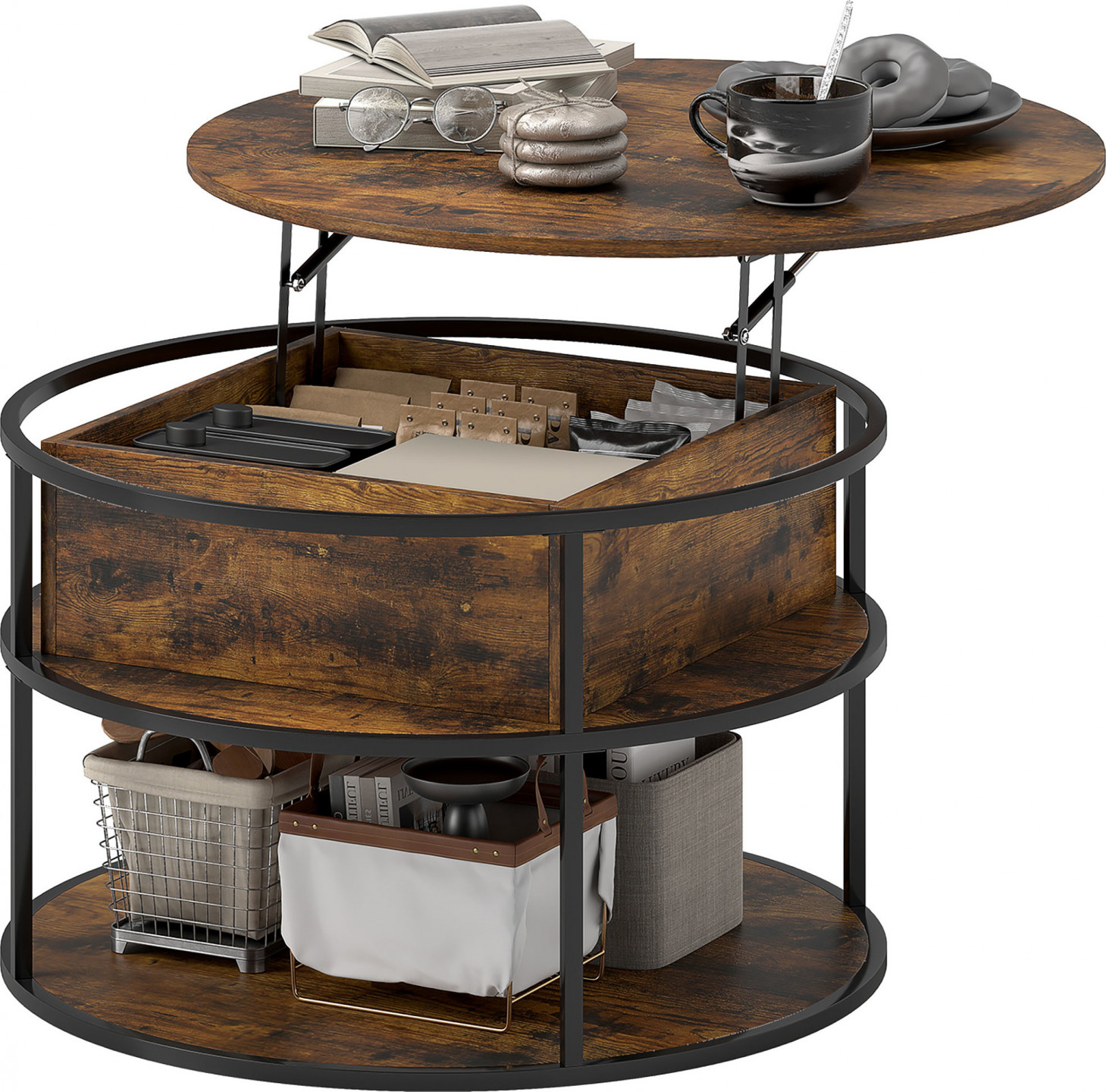 Objevte náš kulatý konferenční stolek: nejen stylový, ale také velmi praktický. Jeho elegantní konstrukce s odklápěcím víkem dokonce promění váš sedací kout v efektivní pracovní místo. Do tajné přihrádky pod deskou stolku schováte notebooky a knihy a do bočních polic uložíte předměty denní potřeby. Tento prostorově úsporný konferenční stolek kombinuje moderní eleganci s funkčním úložným prostorem a obohatí každý obývací pokoj.