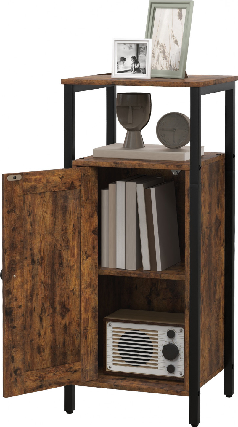Poznejte kouzlo odkládacího stolku, který kombinuje praktickou funkčnost s industriálním stylem. Prostorná skříňka s dvouvrstvou otevřenou horní policí a vnitřní tříúrovňovou nastavitelnou policí je ideální pro diskrétní uložení předmětů denní potřeby. Magnetická dvířka a kulatá úchytka mu dodávají elegantní nádech a skvěle se hodí jako módní odkládací stolek nebo úzký noční stolek do každého útulného koutu.
