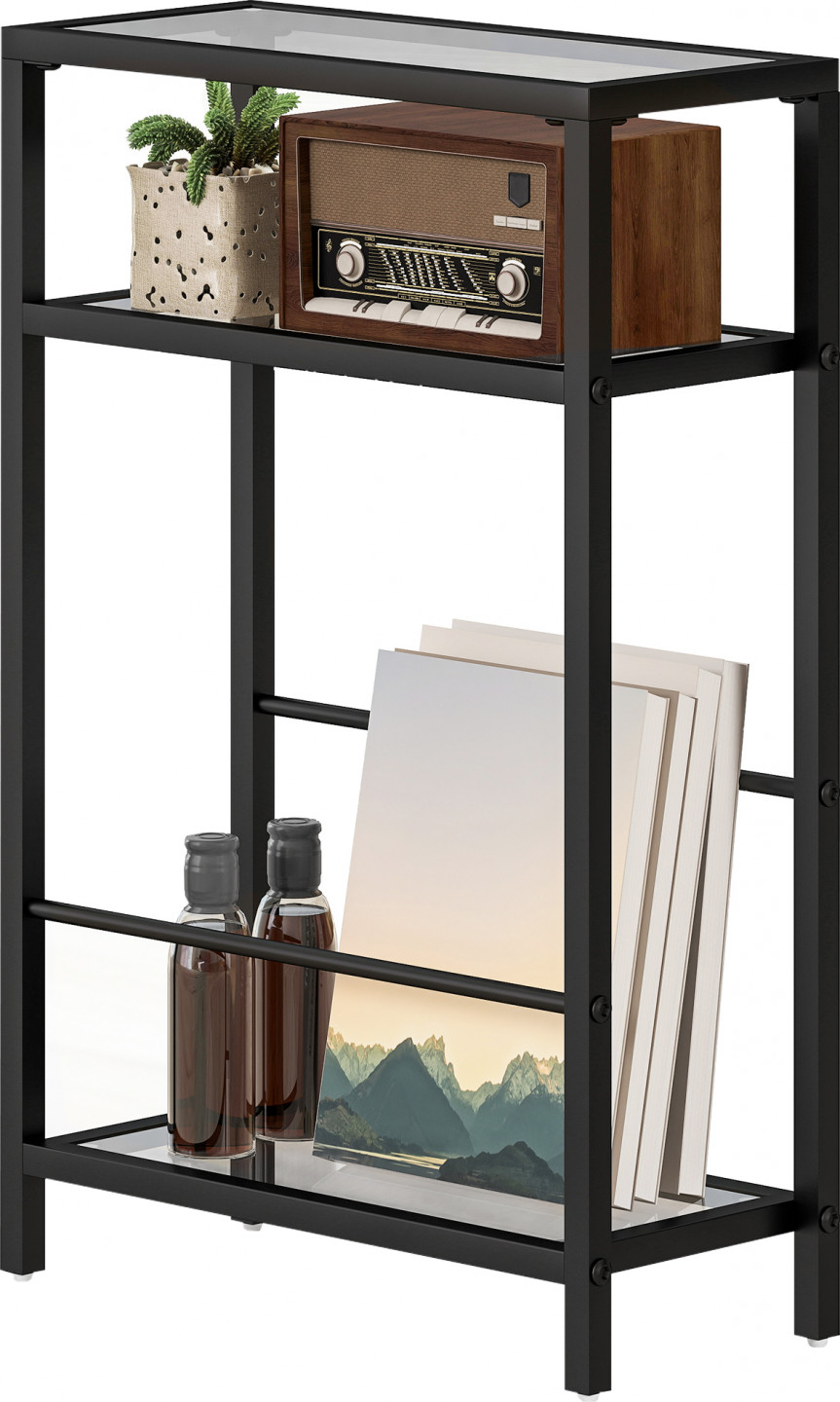 Objevte elegantní tříúrovňovou polici s elegantním tvrzeným sklem, která je ideální do malých prostor. Díky šířce 18 cm je ideální jako štíhlý noční stolek nebo odkládací stolek v obývacím pokoji. Hravé, asymetrické spodní příčky zajišťují originální design a organizaci vašich knih, které obklopuje stylový, práškově lakovaný ocelový rám!
