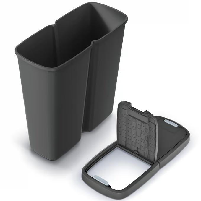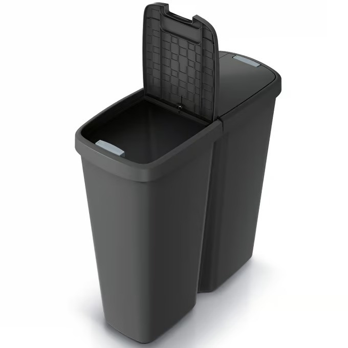 Odpadkový se svým dvoudílným designem je perfektním organizérem do kuchyně, koupelny i kanceláře . Je k dispozici s víkem s okraji v různých barvách, což vám umožňuje kombinovat a úhledně oddělovat organický odpad od plastových obalů a papíru. S objemem 2 x 25 litrů nabízí dostatek prostoru pro denní odpad, který lze vyprázdnit samostatně. Dvě samostatná víka spolehlivě utěsňují nežádoucí pachy a otevírají se stisknutím tlačítka. Víka lze zaaretovat v nejvyšší poloze, zatímco integrovaný držák zajišťuje optimální usazení sáčků. Nádoba nemá přepážku, což umožňuje flexibilní použití malých i velkých sáčků.