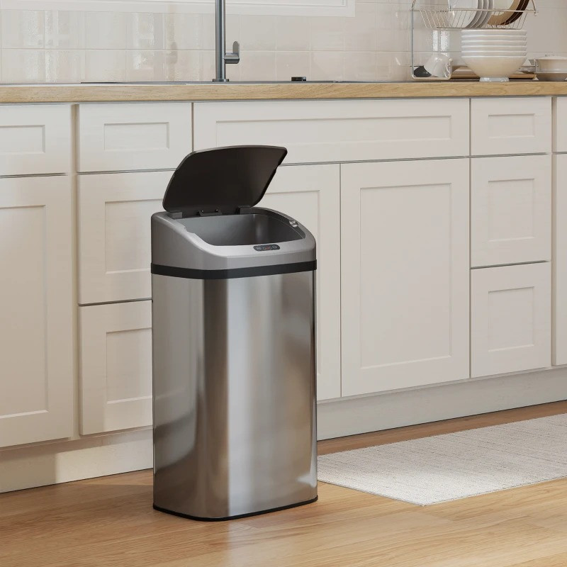 Objevte snadnou likvidaci odpadu se senzorovým košem. Jeho víko se díky infračervené technologii otevře za pouhých 0,5 sekundy - ideální pro zajištění hygieny během rodinného stravování nebo při péči o děti. Díky objemu 48 litrů a absenci vnitřního koše budete muset méně často měnit vložky do koše - ideální pro rušné kuchyně nebo kanceláře. Tento odpadkový koš z nerezové oceli odolný proti otiskům prstů kombinuje eleganci s praktičností.