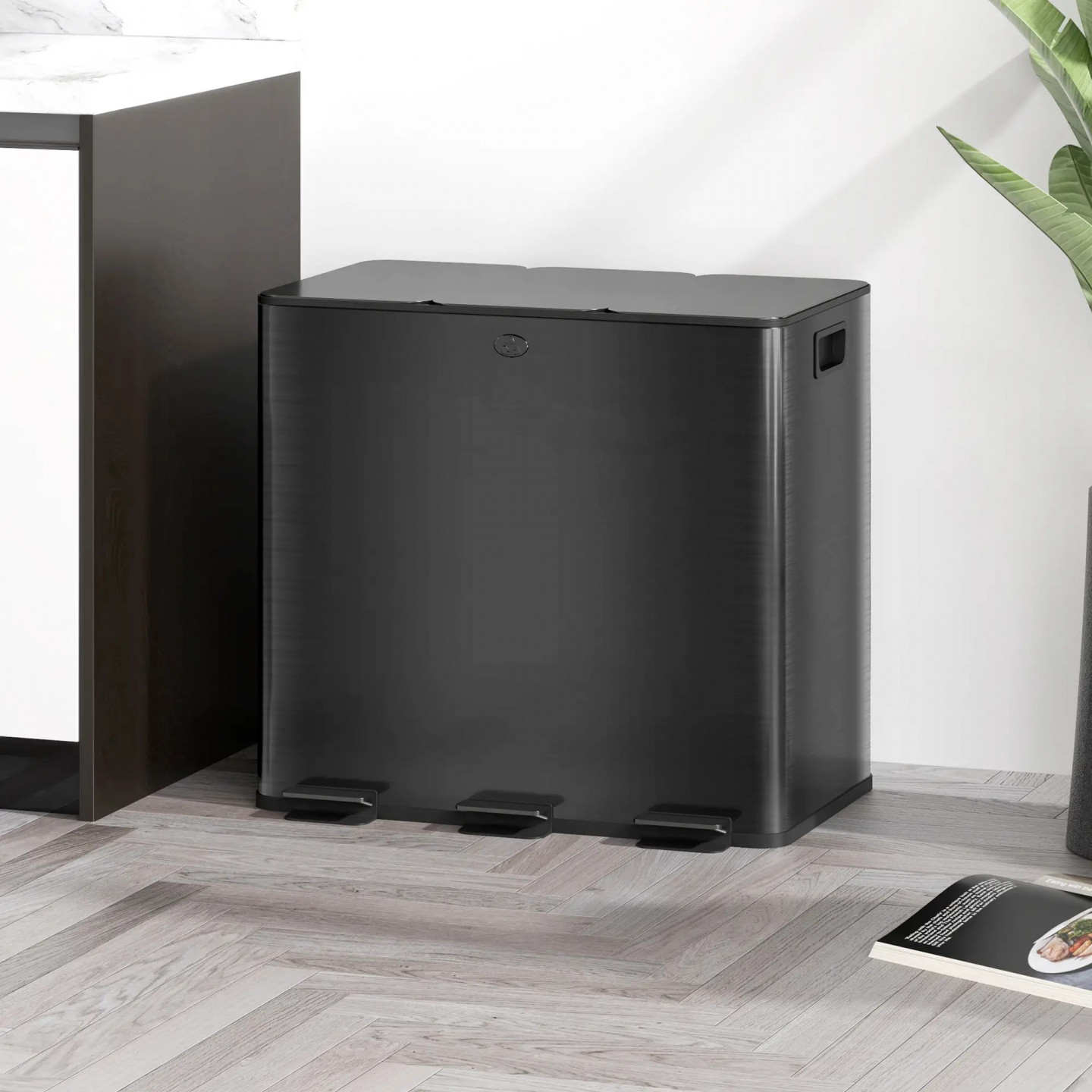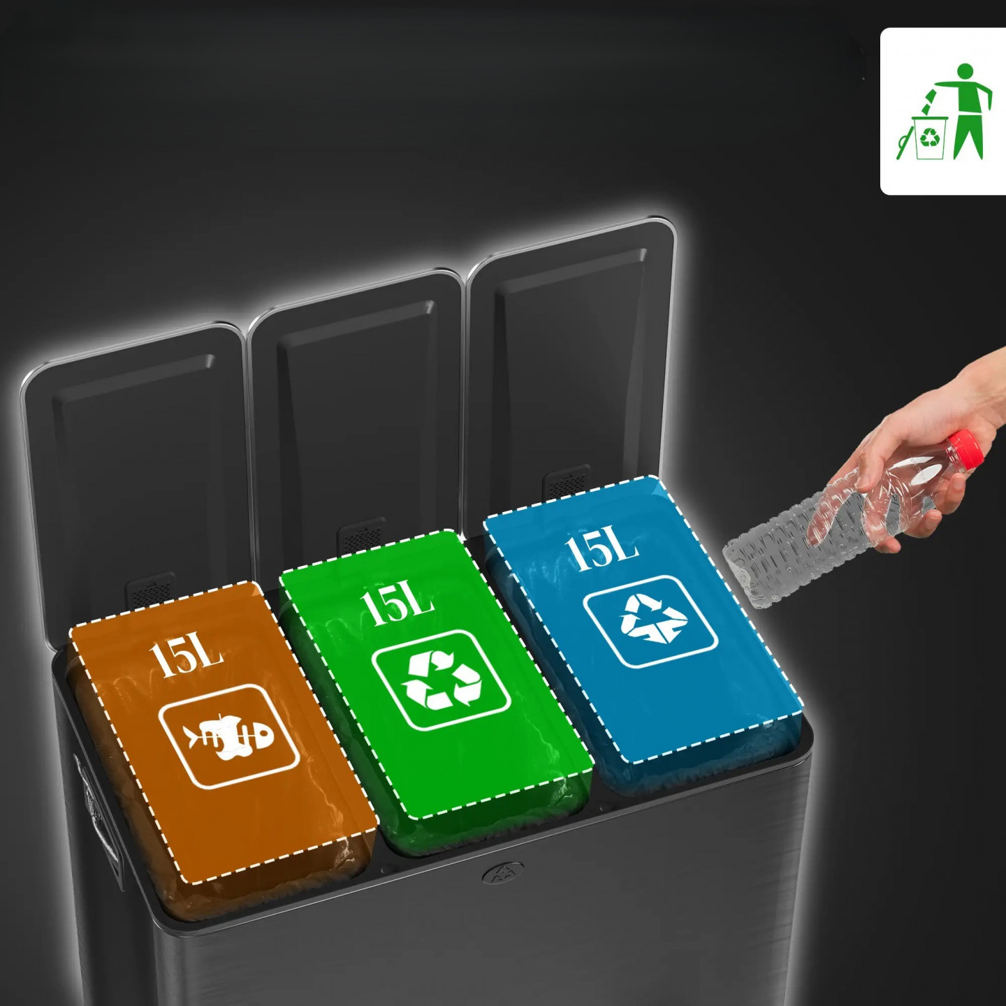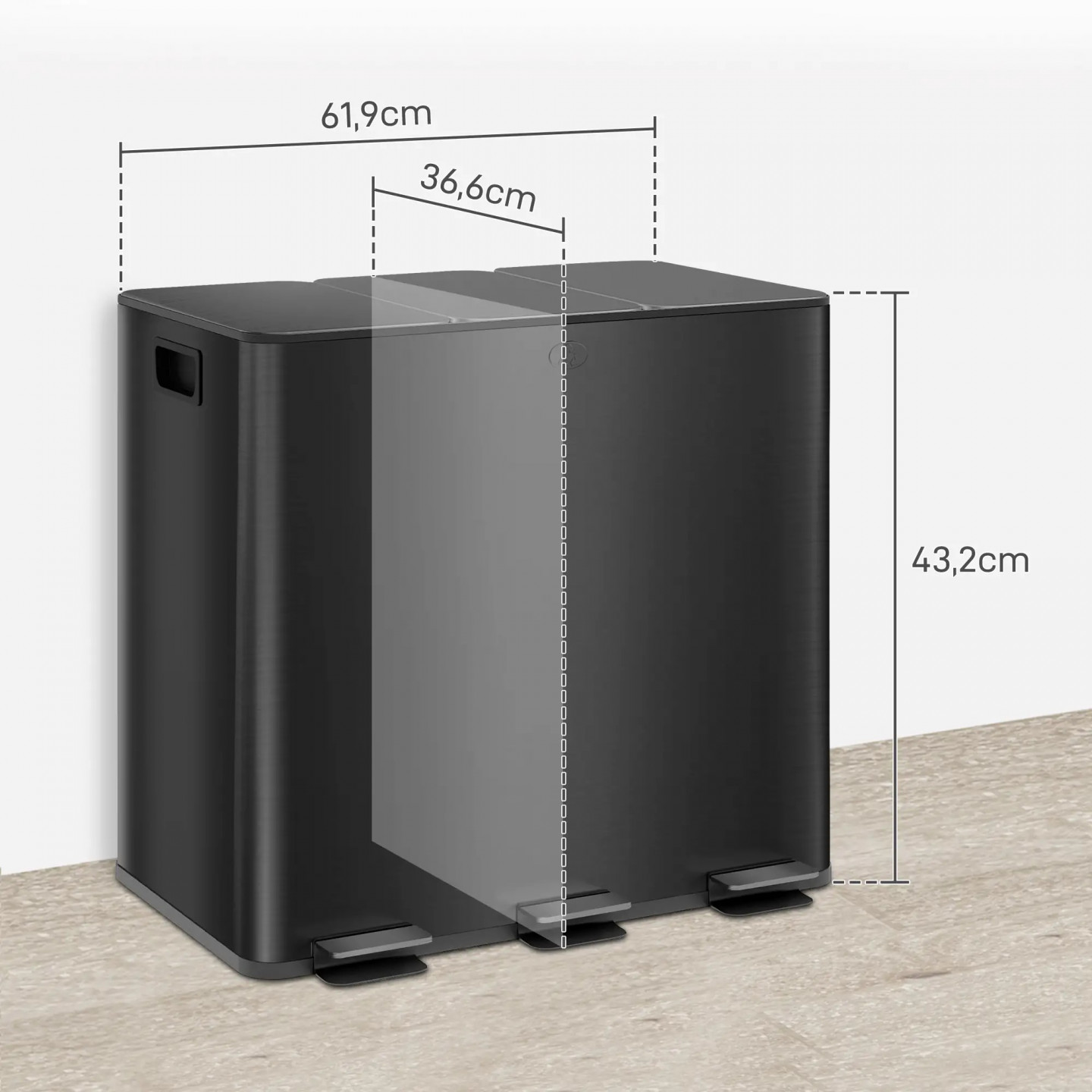 Tento trojitý odpadkový koš nabízí tři přihrádky o objemu 15 l a vestavěné kazety na deodoranty (deodoranty nejsou součástí balení), které bojují proti zápachu. Elegantní nerezový design koše, na kterém nezůstávají otisky prstů, zajišťuje bezchybný vzhled. Tiché, měkce se zavírající víko s praktickými pedály a vyjímatelné pedálové koše usnadňují likvidaci odpadu.