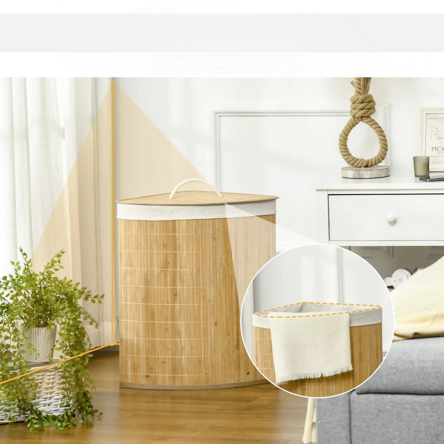 Rohový bambusový koš na prádlo | přírodní + bílý