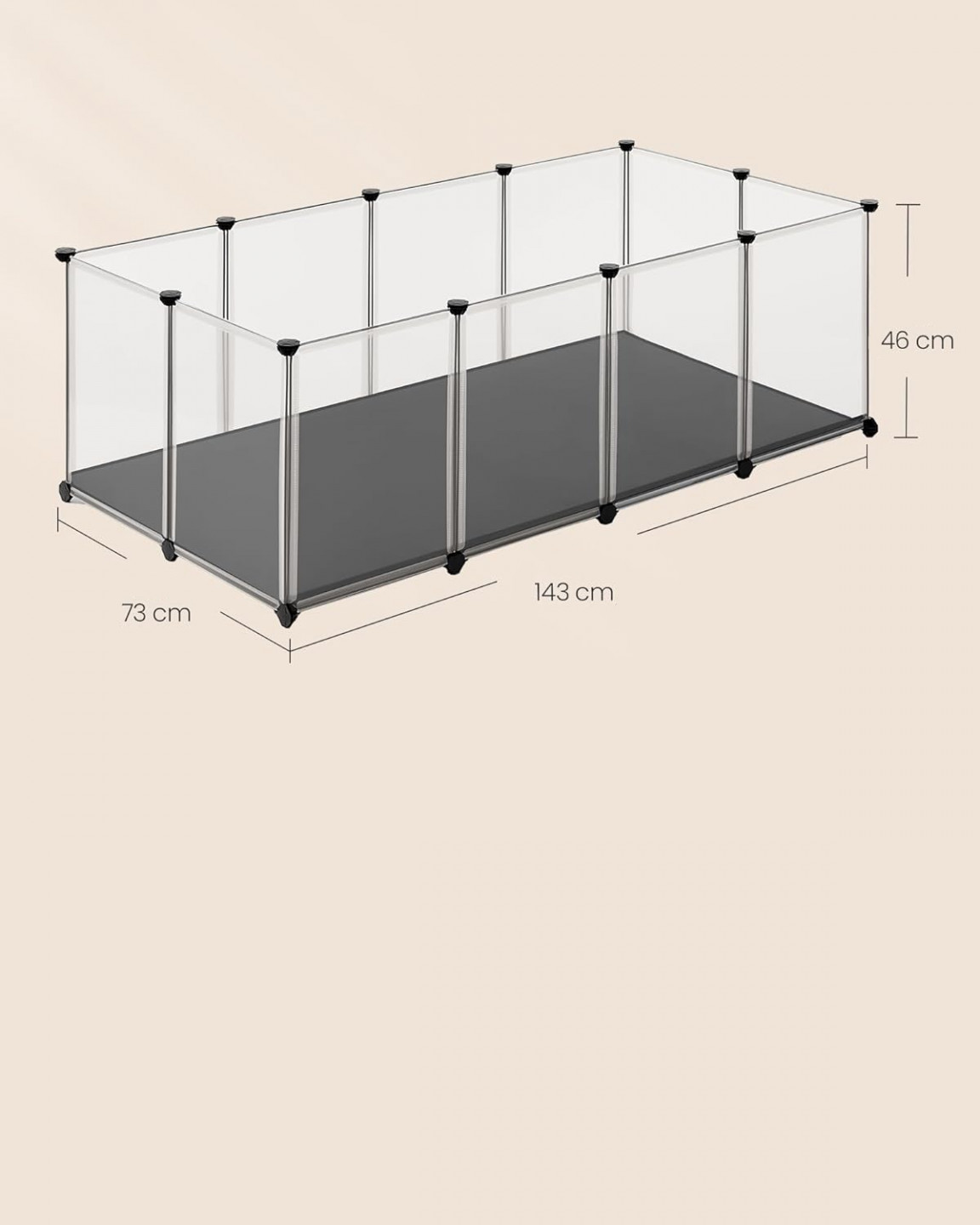 Jednoduše připojte plastové panely k více úhlovým konektorům pomocí přiložené gumové paličky a rychle postavíte tuto ohrádku pro domácí mazlíčky. Lehká konstrukce také umožňuje snadnou demontáž nebo přesun. Tento výběh pro domácí mazlíčky nabízí prostorný prostor pro morčata, křečky, ježky nebo zajíčky, kde mohou běhat, prozkoumávat a bavit se.