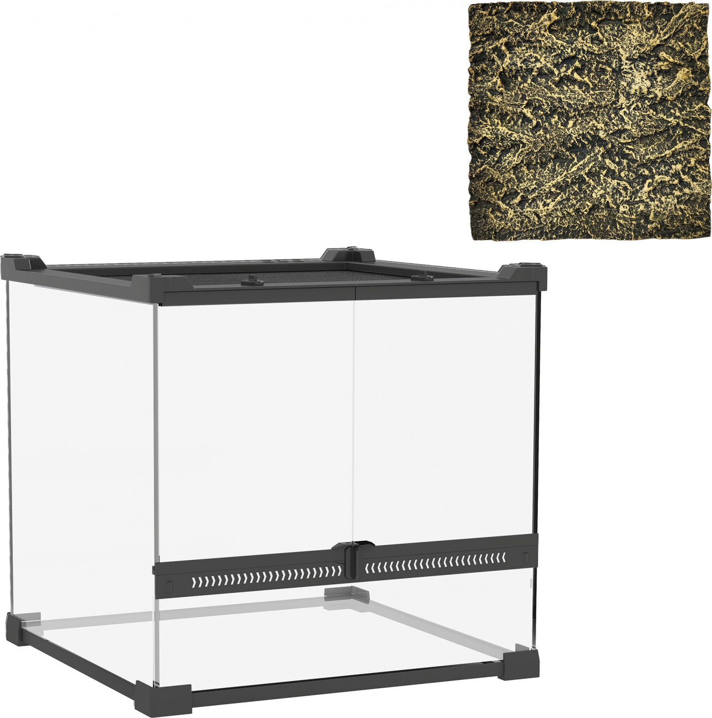 Elegantní skleněné vivárium vám umožní sledovat vašeho plaza z každé perspektivy. Díky 360° výhledu do všech stran můžete mít své zvíře neustále na očích. Přední dvířka s bezpečným otočným zámkem zabraňují útěkům, zatímco síťovaná střecha zajišťuje neustálý přísun čerstvého vzduchu. Ideální pro ještěry, hady, žáby, želvy a další.