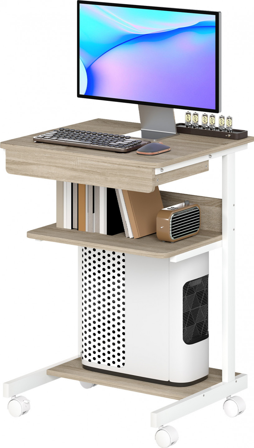 Pojízdný stůl usnadňuje pohyb ve stísněných a nepřehledných prostorách díky otočným kolečkům a uzamykatelným předním kolečkům, která zajišťují stabilitu. Nezbytné věci zůstanou uspořádané díky prostorné zásuvce a dvoupatrové polici. Dřevěná deska a elegantní kovový rám počítačového stolu dodávají moderní eleganci. Ideální pro moderní rodiny, které si cení stylu i funkčnosti v malých prostorách.