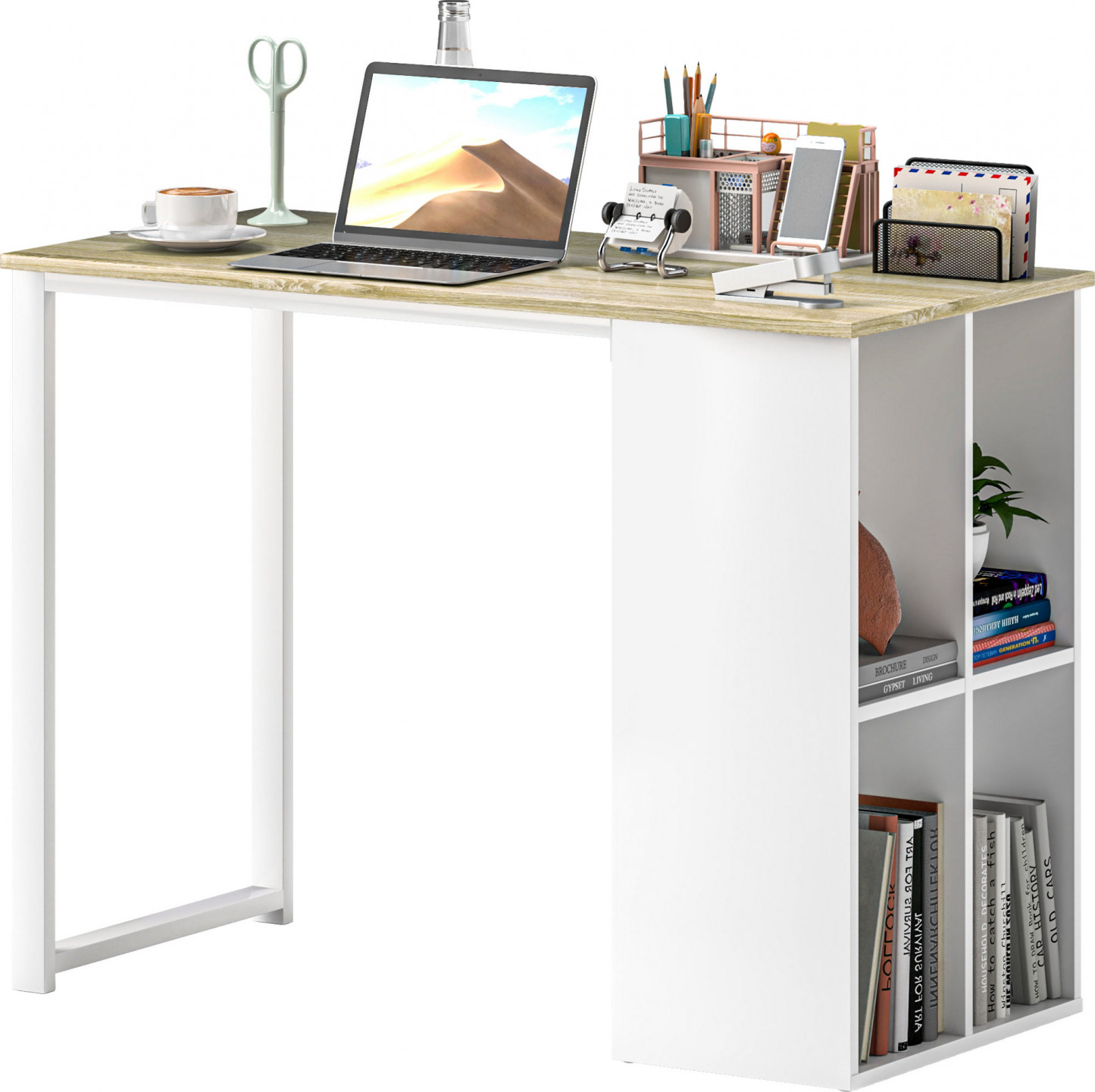 Oživte svůj pracovní prostor počítačovým stolem, který kombinuje moderní dubový povrch s čistě bílou povrchovou úpravou. Kompaktní psací stůl o rozměrech 100 x 54 cm je ideální do každé domácí pracovny, kanceláře nebo pokoje. Má čtyři otevřené přihrádky pro přehledné uspořádání a kvalitní dřevotřískový a ocelový rám i protiskluzové podložky pod nohy pro stabilní použití.
