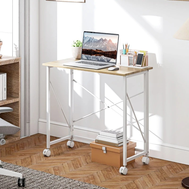 Objevte skládací stůl: je kompaktní, schová se za dveře nebo pod nábytek a optimalizuje prostor. Díky čtyřem kolečkům (dvě s brzdou) je ideální jako stůl do domácí kanceláře, studijní stůl nebo kompaktní počítačový stůl.
