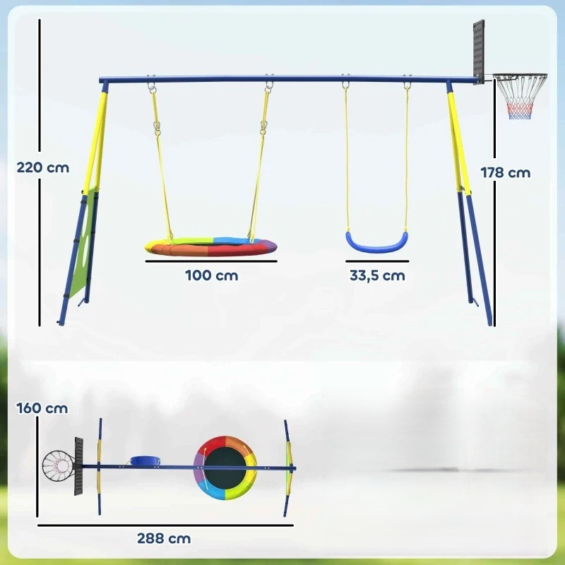 - Součástí je houpačka, houpačka do U, basketbalový koš a fotbalová branka pro nekonečnou zábavu.