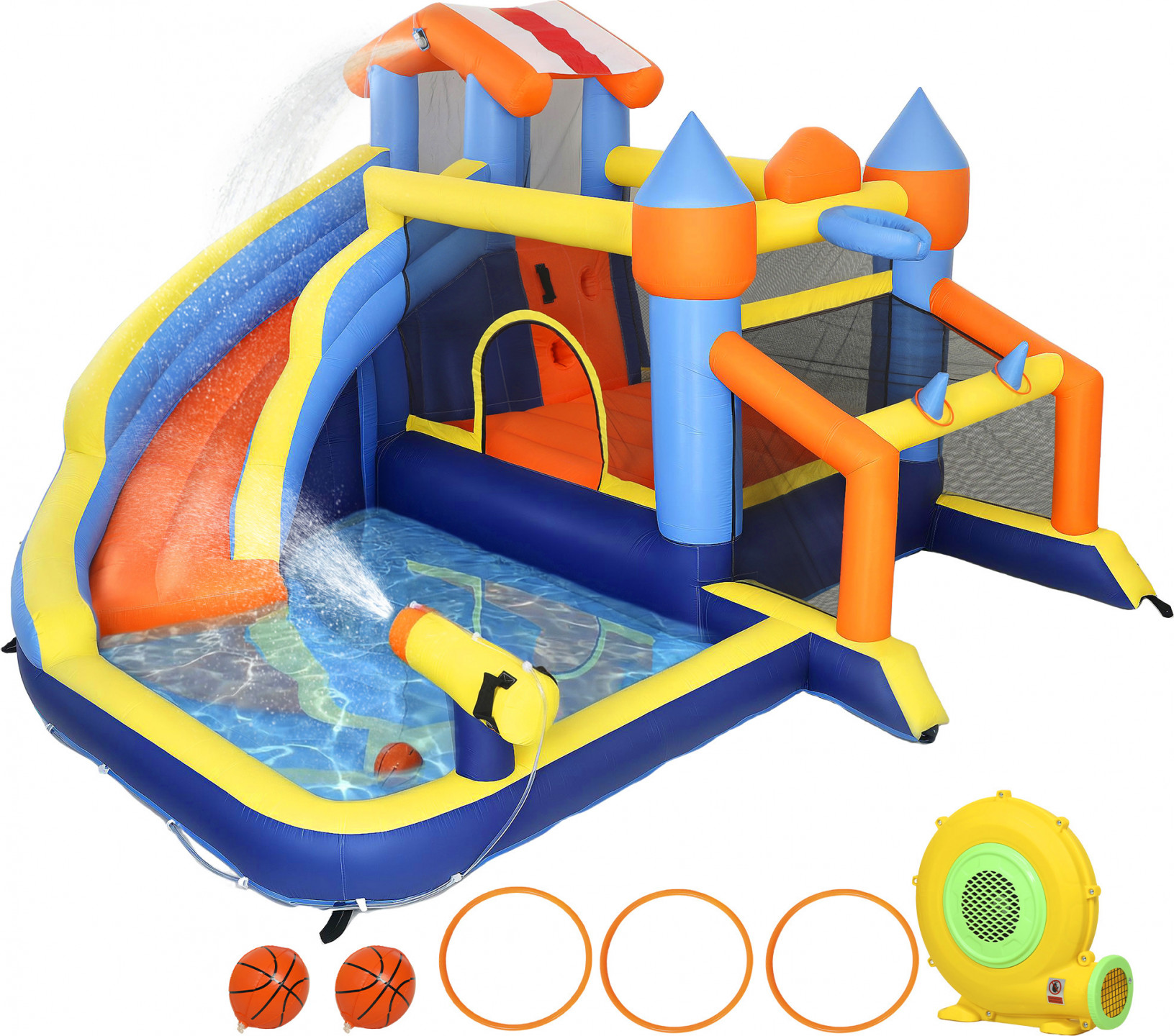 Vneste do své zahrady nekonečnou zábavu se skákacím hradem! Děti mohou skákat na trampolíně, sjíždět po skluzavkách, lézt po stěnách, cákat se v bazénku, používat vodní blaster, střílet na koš, dávat góly a házet kroužky. Vyrobeno z robustní oxfordské tkaniny se zesílenými švy, nafouknuto za 1 minutu pomocí foukačky a s veškerým příslušenstvím - ideální pro oslavy, léto a celoroční zábavu!