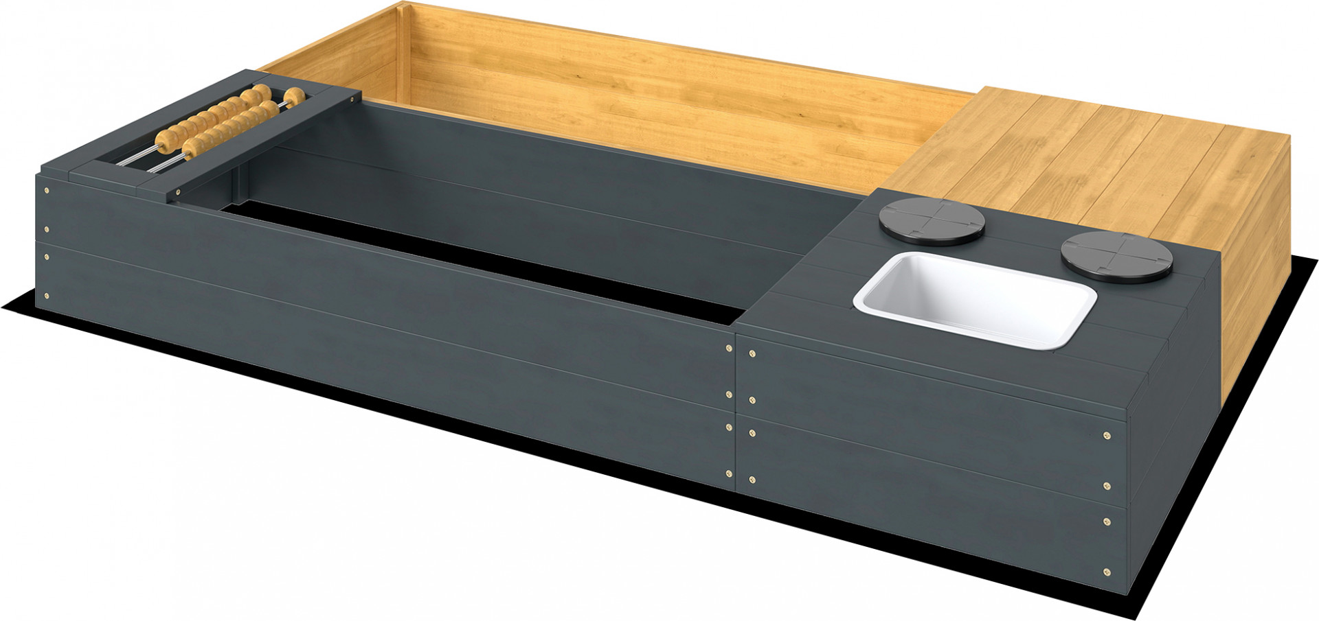 Proměňte svou zahradu v kreativní svět fantazie s dětským pískovištěm. Díky pískovišti, odnímatelnému umyvadlu, místům k sezení a úložnému prostoru umožňuje dětem společně objevovat, vařit a stavět. Díky flexibilní konstrukci lze obě části uspořádat podle potřeby. Robustní dřevěná konstrukce a vodoodpudivý povrch zajišťují roky bezpečné zábavy při hře. Ideální pro venkovní dobrodružství a společné hraní.