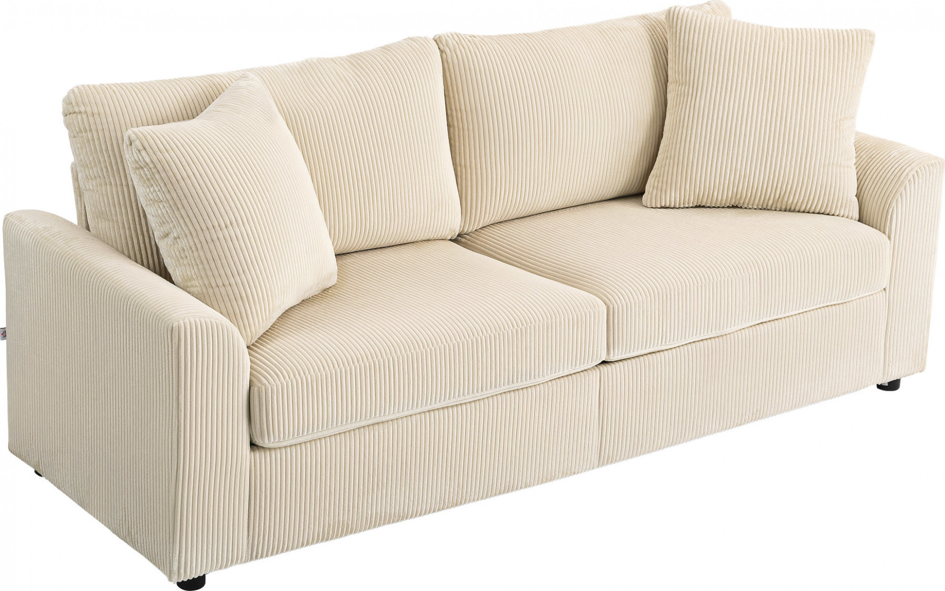 Tato třímístná pohovka je vybavena polštářem s pružinovým jádrem a pěnou s vysokou hustotou pro bezkonkurenční oporu. Tato pohovka, zabalená do potahu z manšestru šetrného k pokožce, který je prodyšný a zároveň stylový, je spolu se dvěma útulnými dekoračními polštáři skvělým doplňkem každého obývacího pokoje a kombinuje pohodlí s nádechem elegance.