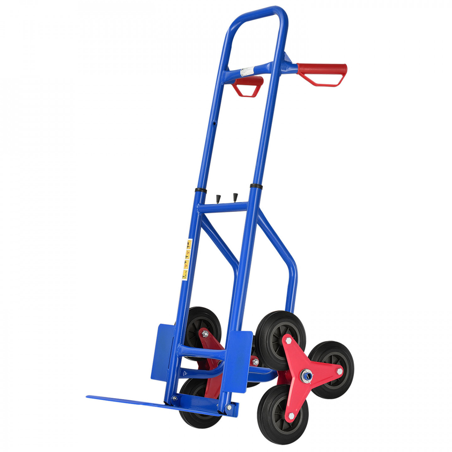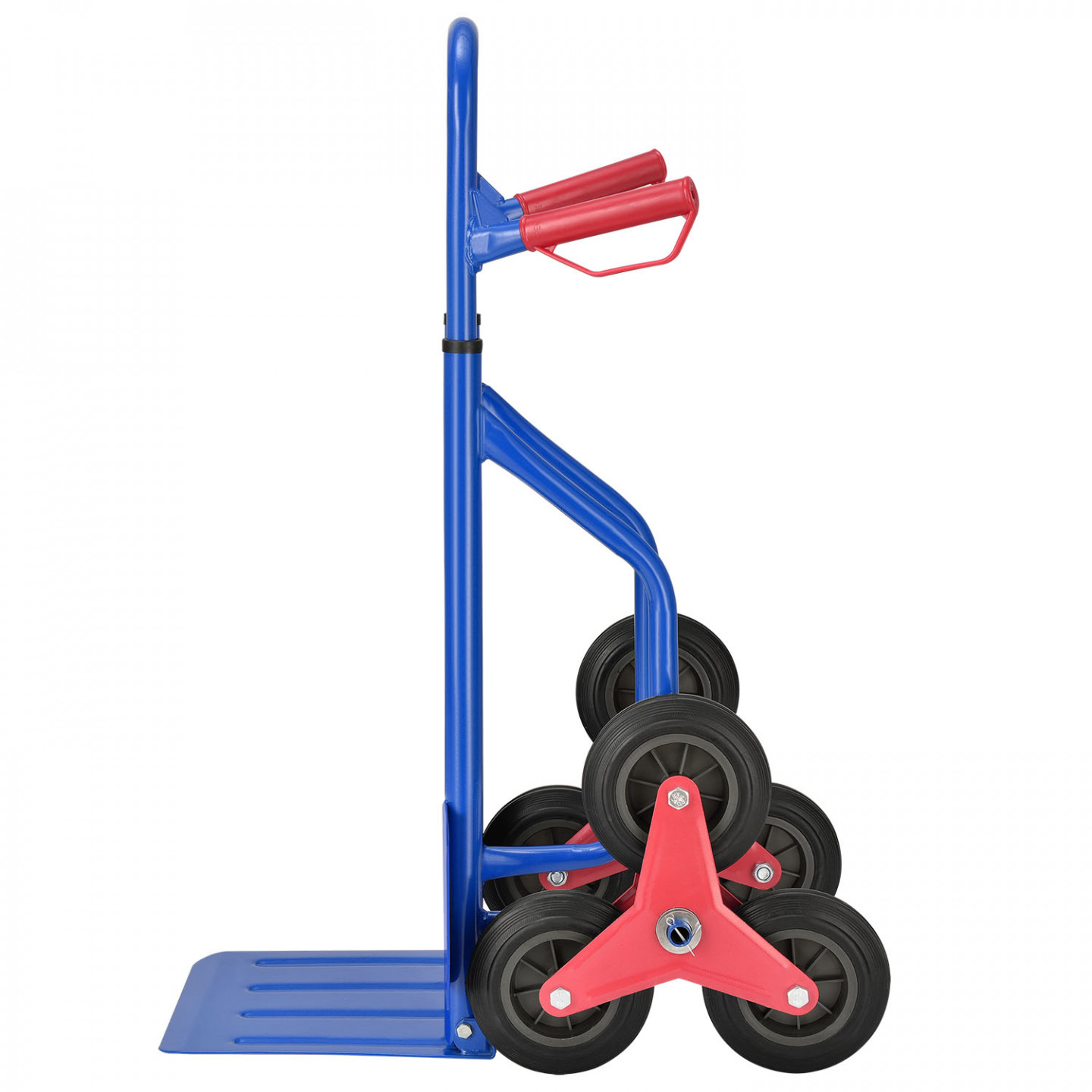 Manipulační vozík se stabilní práškově lakovanou ocelovou konstrukcí, šesti kolečky a bezpečnostními madly, pro snadnou manipulaci s nadměrným a těžkým zbožím na schodišti.