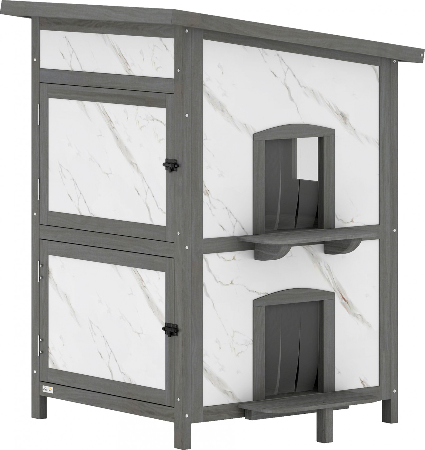 Vytvořte své kočce teplý a chráněný venkovní prostor s tímto dvoupatrovým domkem pro kočky. Hliníková izolace zajišťuje útulnost po celý rok. Vodotěsná střecha, plastové klapky a zvýšená podlaha poskytují účinnou ochranu proti vlhkosti a větru. Tento venkovní domek pro kočky, vyrobený z masivního dřeva a vybavený dvěma výklopnými dvířky, pojme až 5 kg a je ideální pro venkovní nebo toulavé kočky.