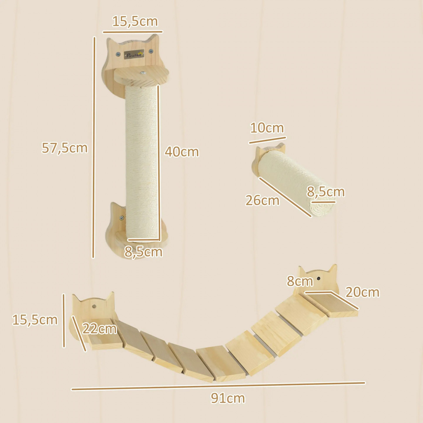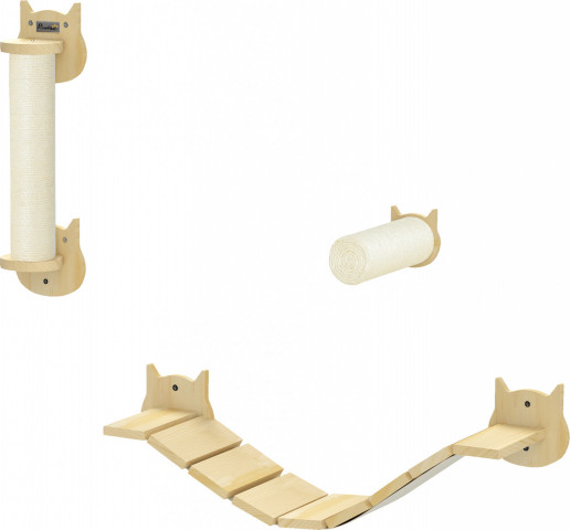 Tato sada nástěnného škrabadla obsahuje škrabadlo, schůdek a žebřík, které jsou ideální pro uspokojení touhy kočky po šplhání a úsporu místa na podlaze. Toto elegantní nástěnné šplhací zařízení pro kočky, vyrobené z masivního borovicového dřeva, se harmonicky začlení do vašeho obytného prostředí a ochrání váš nábytek před škrábanci.