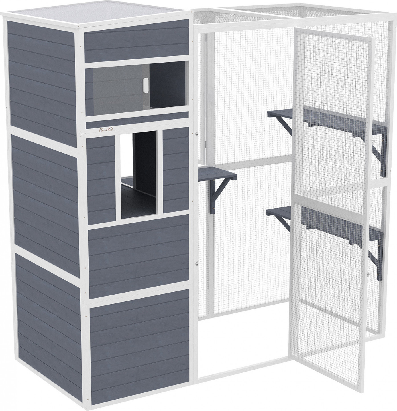 Navržený výběh pro kočky nabízí kočkám dostatek prostoru pro šplhání, ležení a zkoumání. Díky dvířkům od podlahy ke stropu můžete snadno vstoupit dovnitř a čistit nebo si hrát se svým mazlíčkem. Prostorné uspořádání a sluneční stříška odolná proti povětrnostním vlivům nabízí několika kočkám bezpečný ráj pro slunění nebo pobyt v suchu. Tento venkovní výběh pro kočky obohatí život vašich koček a zároveň vám usnadní každodenní život.