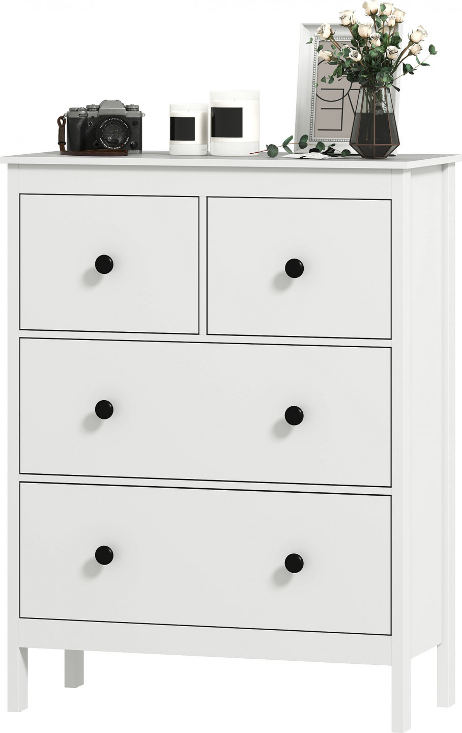V zásuvkách této komody - dvou malých a dvou velkých - můžete uspořádat a uložit oblečení, ložní prádlo a předměty denní potřeby. Její čistě bílý design s černými kulatými úchyty dodává moderní šarm a bez problémů se hodí do každé ložnice nebo předsíně. Komoda se 4 zásuvkami vnese do vaší domácnosti svěžest a organizaci.
