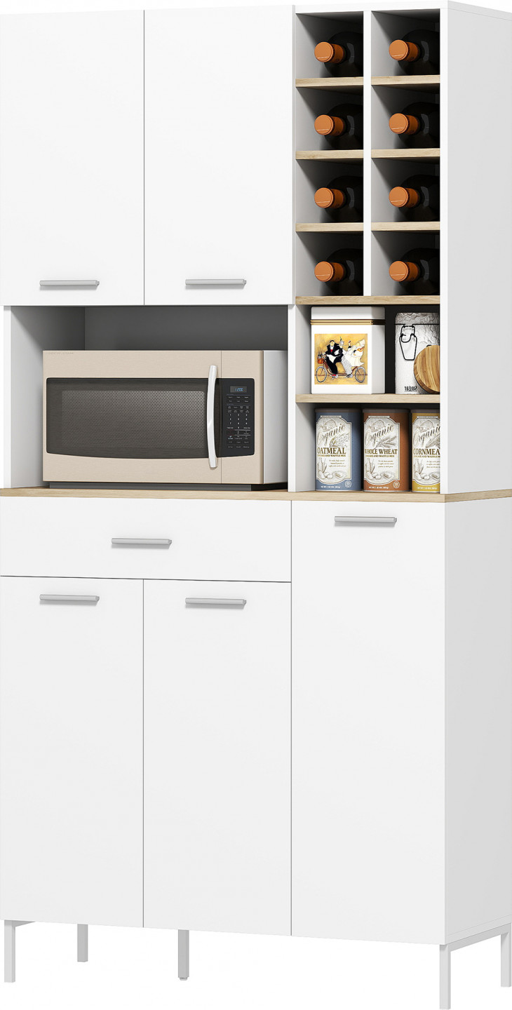 Poznejte kouzlo a praktičnost kuchyňské linky. Tento elegantní dvoubarevný kuchyňský bufet nabízí tři velké skříňky a dvě otevřené police - ideální pro uložení základního vybavení a vystavení dekorativních prvků. Díky chytře integrované zásuvce a stojanu na víno pro osm lahví je možná stylová organizace. Vhodná do každé moderní kuchyně!