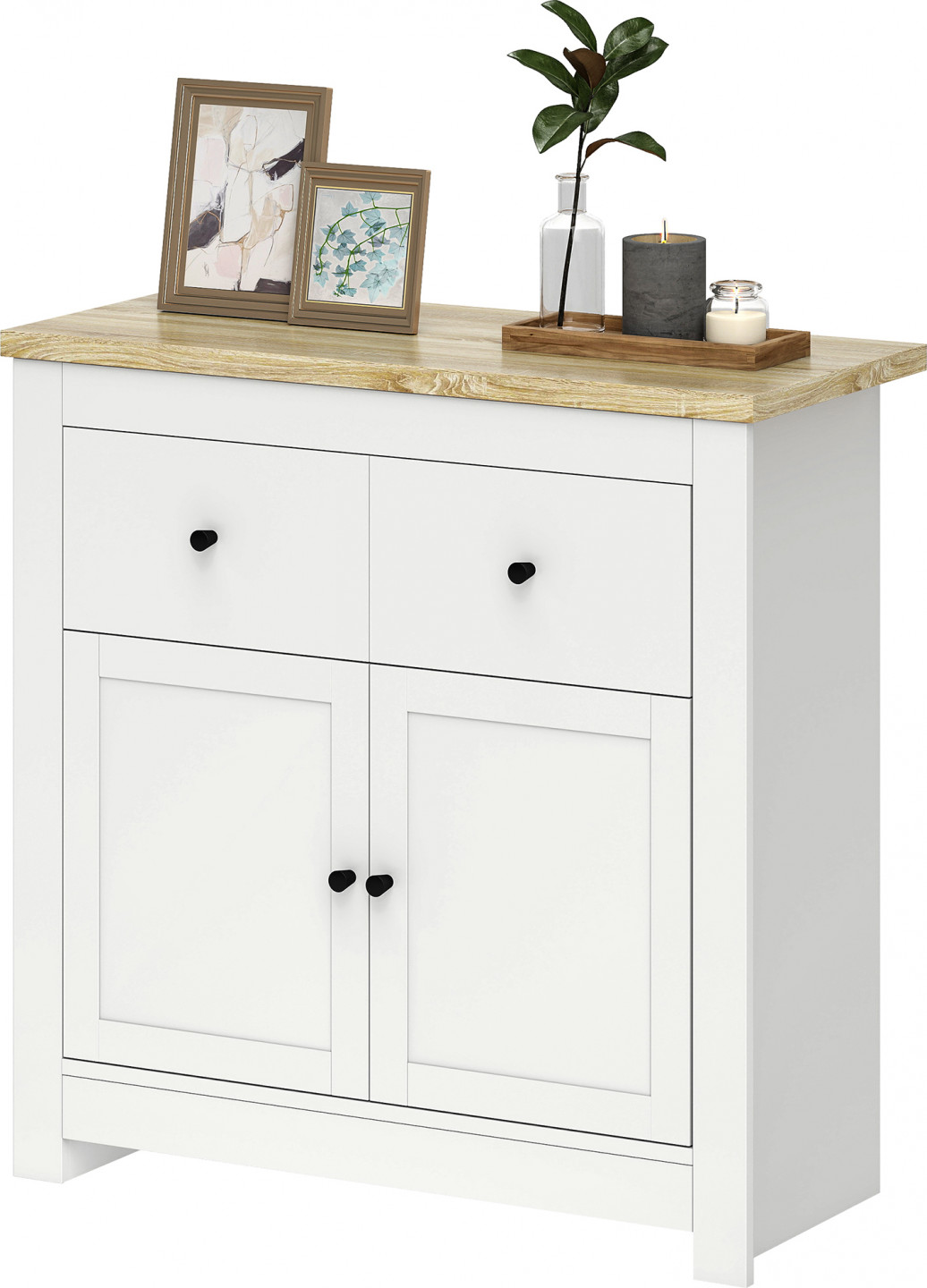 Optimalizujte svůj obývací prostor pomocí této komody, která vám zajistí stylovou organizaci. Dvě hladce posuvné zásuvky a prostorná dvoudveřová skříňka nabízejí dostatek úložného prostoru. Elegantní dvoubarevný design boční skříňky dokonale zapadne do každého interiéru a je ideální do obývacího pokoje, kuchyně, předsíně nebo jídelny. Skvěle se hodí k vystavení dekorativních předmětů, uložení domácích potřeb nebo uskladnění občerstvení.