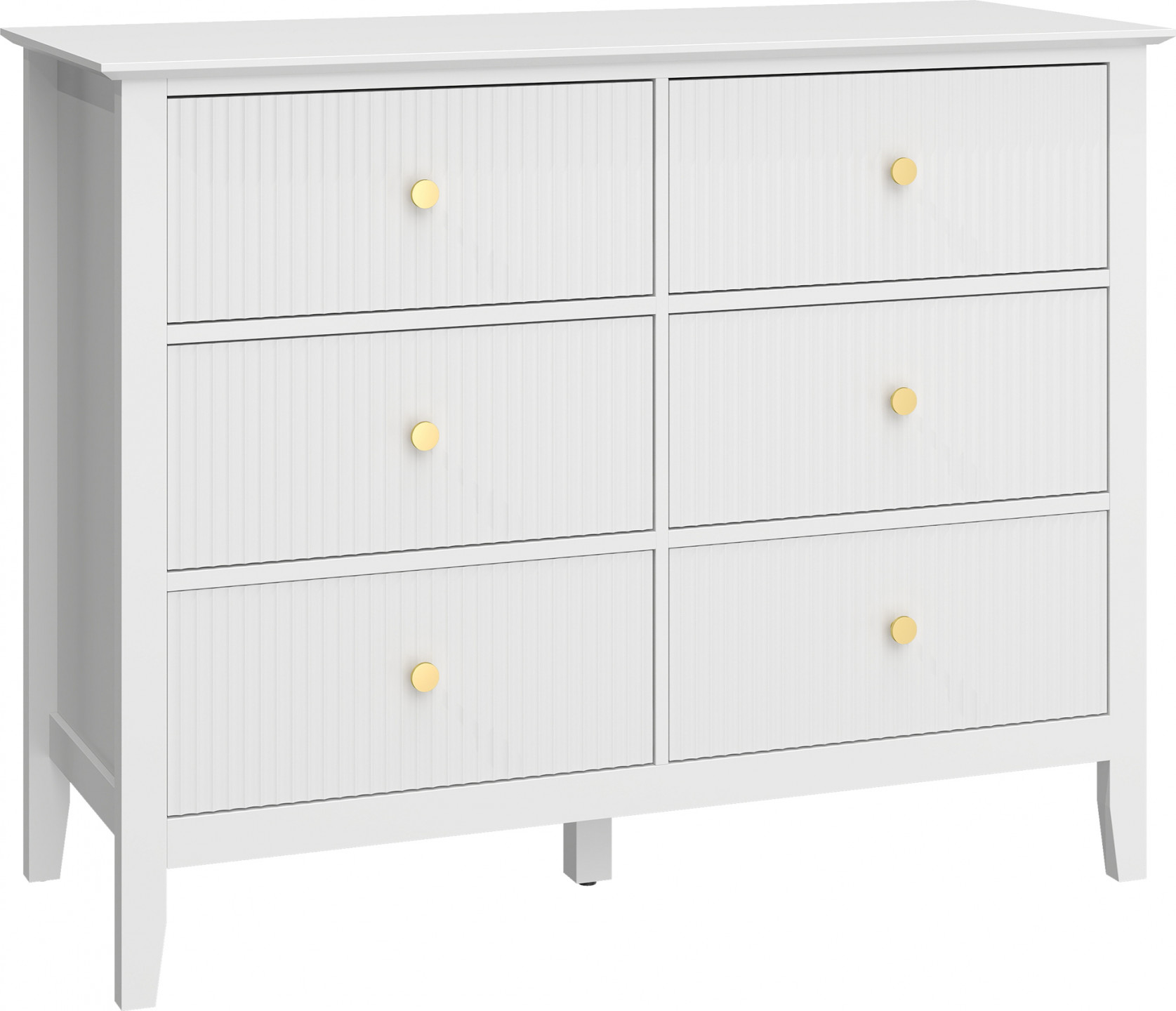 Pokud vaše ložnice působí neuspořádaně, komoda se šesti zásuvkami a velkou plochou okamžitě obnoví pořádek a eleganci. Čelní strany komody připomínající šerpu a úchytky ve zlaté barvě jí dodávají moderní šarm, zatímco zpevněný rám, nastavitelné nožky a mechanismus proti překlopení zajistí stylovou a přehlednou domácnost.