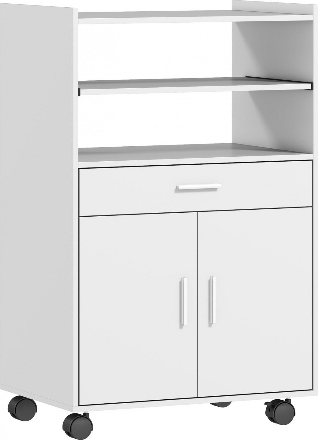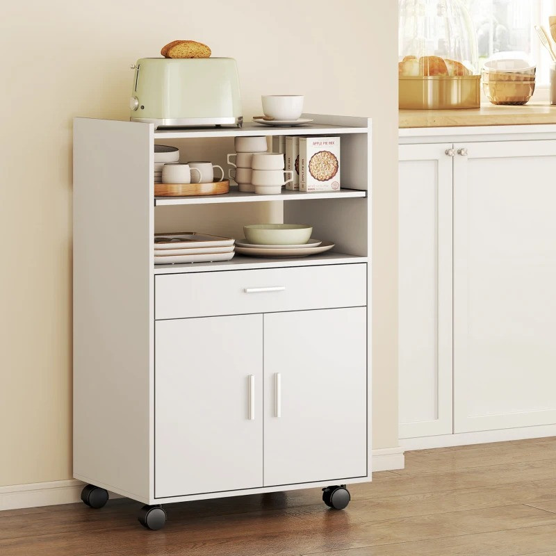 Potýkáte se s nedostatkem místa v kuchyni? Tato skříňka na mikrovlnnou troubu s prostornou pracovní deskou, výsuvnou policí, zásuvkou a spodní skříňkou uspořádá vaše kuchyňské náčiní. Díky otočným kolečkům se kuchyňská skříňka snadno přemisťuje, optimalizuje uspořádání vaší kuchyně a poskytuje bezpečnou oporu pro mikrovlnnou troubu a další spotřebiče. Tento kuchyňský bufet zajišťuje absolutní bezpečnost ve skutečně funkční a bezpečné kuchyni.