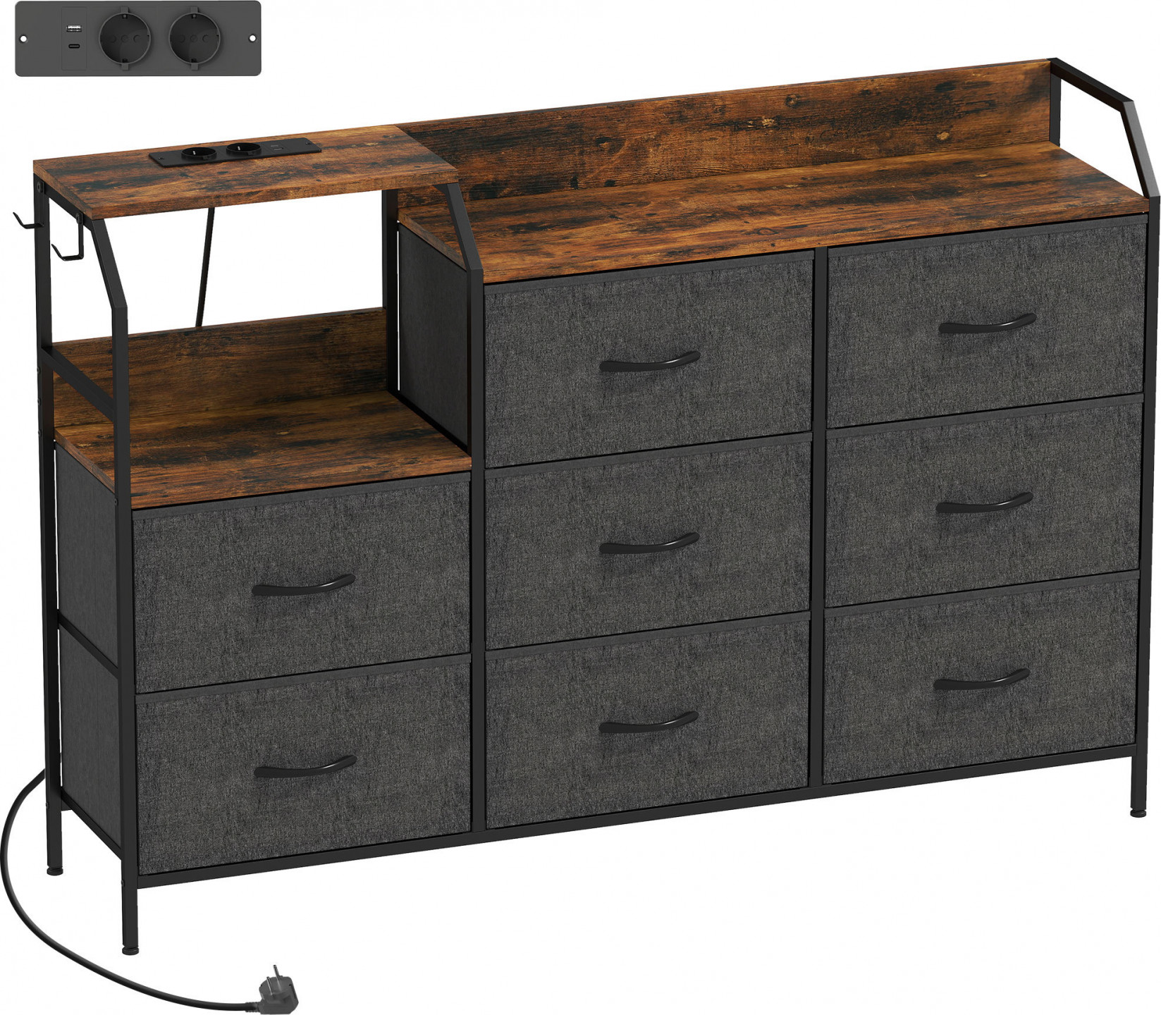 Zamotané kabely a nepřehledné povrchy vytvářejí nepořádek. Látková komoda vytváří pořádek a funkčnost díky vestavěné nabíjecí stanici. Nabíjí mobilní telefon, tablet a lampu a zároveň přehledně ukládá kabely. Osm látkových zásuvek a stupňovitá plocha nabízí dostatek prostoru pro oblečení a dekorace. Háčky po stranách jsou ideální také na tašky a sluchátka. Komoda v rustikálních odstínech hnědé a černé barvy dodá každé místnosti nádech industriálního kouzla.