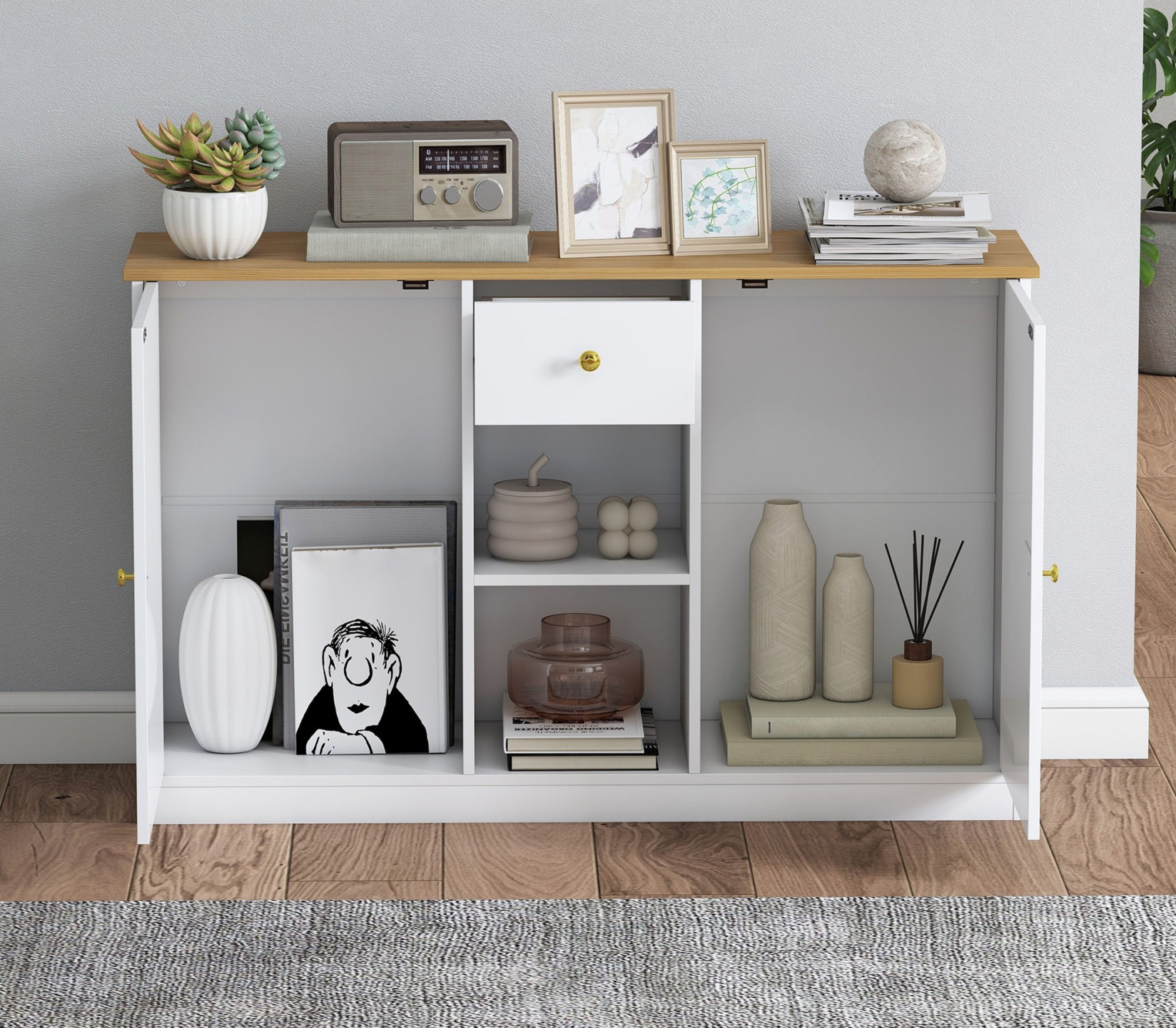 Hledáte elegantní řešení pro vytvoření pořádku? Moderní příborník nabízí spoustu úložného prostoru s širokou plochou, zásuvkou, dvěma skříňkami a dvěma otevřenými policemi - ideální na nádobí, knihy nebo věci denní potřeby. Svěží bílý design obývací skříně s horní deskou v dřevěném provedení, dvířky shaker a zlatými úchytkami dodává obývacímu pokoji útulný a stylový nádech. Skvěle se hodí do obývacího pokoje, jídelny, předsíně nebo kuchyně.
