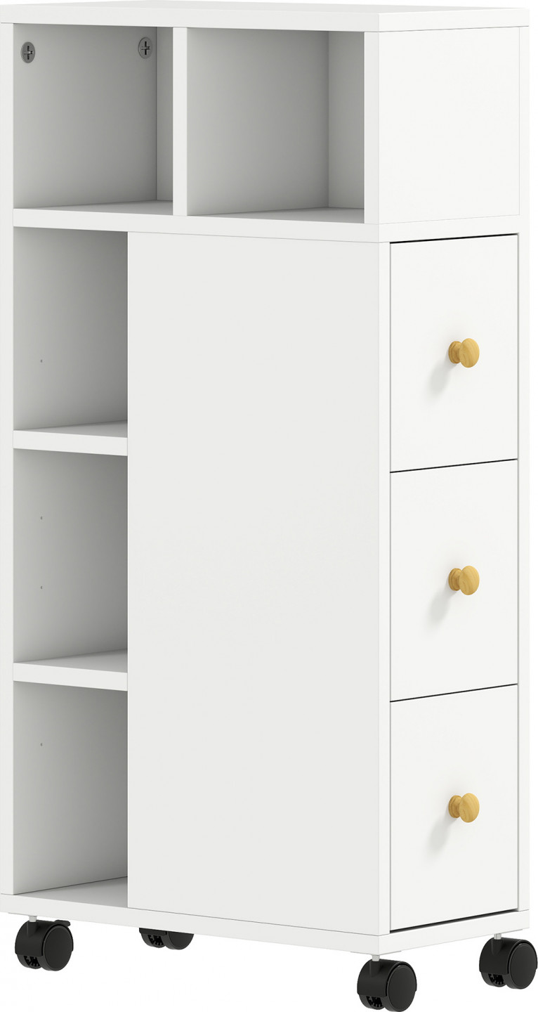 Nepořádek v koupelně může ztížit začátek dne. Koupelnová skříňka se třemi zásuvkami a pěti otevřenými přihrádkami nabízí promyšlené řešení pro vaši kosmetiku a ručníky. Díky prostorově úspornému provedení koupelnová skříňka dokonale zapadne do úzkých výklenků a zajistí uklizenou atmosféru. Úložná skříňka je vyrobena z materiálů šetrných k životnímu prostředí, je odolná a vlhkuvzdorná, takže je ideální do vlhkých koupelen.